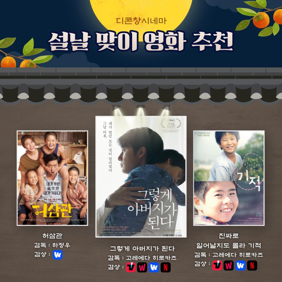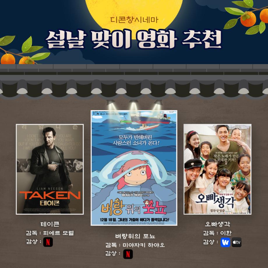 본문 시작 홈으로 MCC News 학과소개 교수소개 학과과정 MCC News MCC SNS 홈페이지가이드 학과 및 재학생 학과 및 재학생 교수 및 졸업생 미디어 정보통 학과 및 재학생 페이스북 트위터 프린트 설날 맞이 영화 추천 디지털콘텐츠창작학과 3977 2023-01-20 명절을 맞이해서 가족과 함께 볼 수 있는 영화를 추천해 드려요! 이번 설에는 가족과 함께 영화를 보는 건 어떨까요? 목록 이전🍭 오늘의 디콘 11탄 🍭 다음 세명인이라면 알아야 할 꿀팁 앱 담당부서 : 미디어콘텐츠창작학과 담당자 : - 연락처 : 043-649-1741 최종수정일 : 2024-10-26 만족도조사 만족도 조사 이 페이지에서 제공하는 정보에 대하여 만족하시나요? 매우만족 만족 보통 불만족 매우불만족