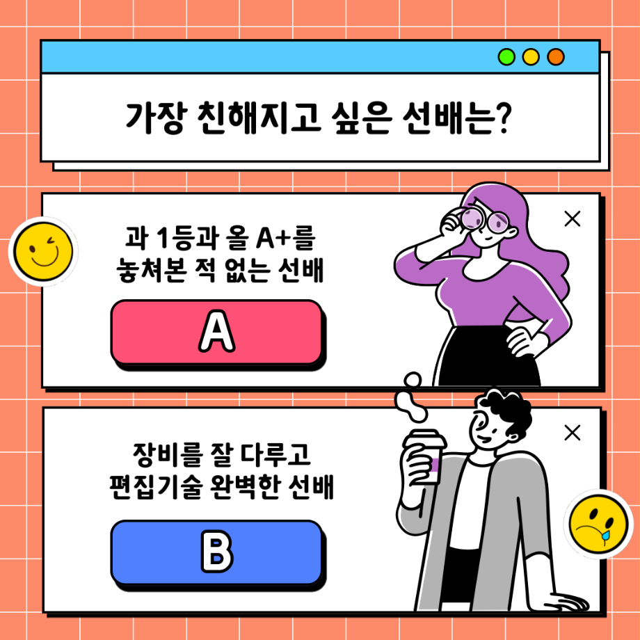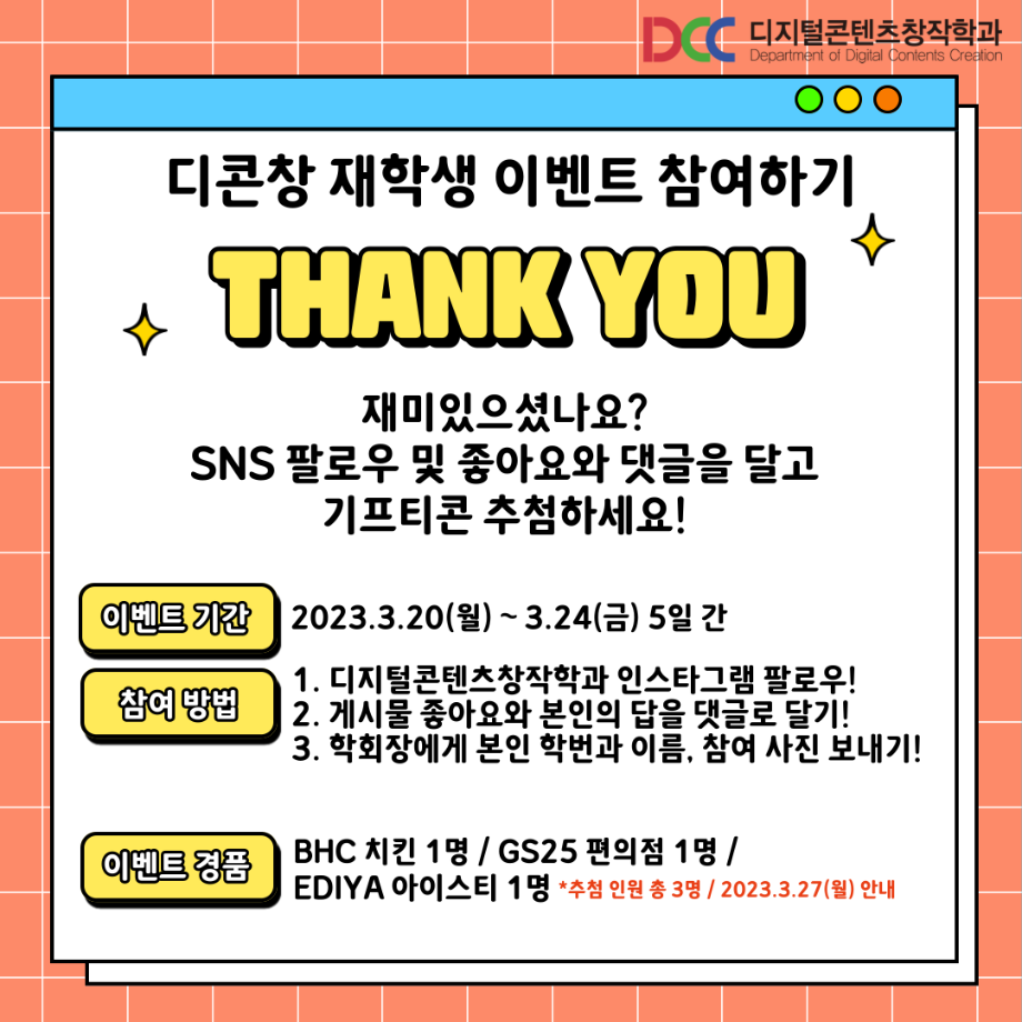 본문 시작 홈으로 MCC News 학과소개 교수소개 학과과정 MCC News MCC SNS 홈페이지가이드 학과 및 재학생 학과 및 재학생 교수 및 졸업생 미디어 정보통 학과 및 재학생 페이스북 트위터 프린트 ✨디콘창 밸런스 게임✨ 디지털콘텐츠창작학과 4759 2023-03-20 디지털콘텐츠창작학과 밸런스 게임을 준비했습니다! 여러분의 선택을 댓글로 알려주세요! 디콘창 재학생 이벤트로 진행하고 있으니 많은 참여 부탁드립니다! ❗이벤트 참여 방법❗ 1. 디지털콘텐츠창작학과 인스타그램 팔로우 2. 게시물 좋아요와 본인의 답을 댓글로 달기 3. 학회장에게 본인 학번과 이름, 참여 사진 보내기 목록 이전미리 취득하면 도움 되는 자격증📝 다음 🍭 오늘의 디콘 13탄 🍭 담당부서 : 미디어콘텐츠창작학과 담당자 : - 연락처 : 043-649-1741 최종수정일 : 2024-10-26 만족도조사 만족도 조사 이 페이지에서 제공하는 정보에 대하여 만족하시나요? 매우만족 만족 보통 불만족 매우불만족