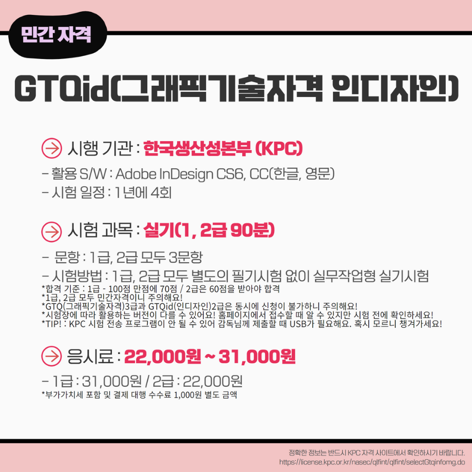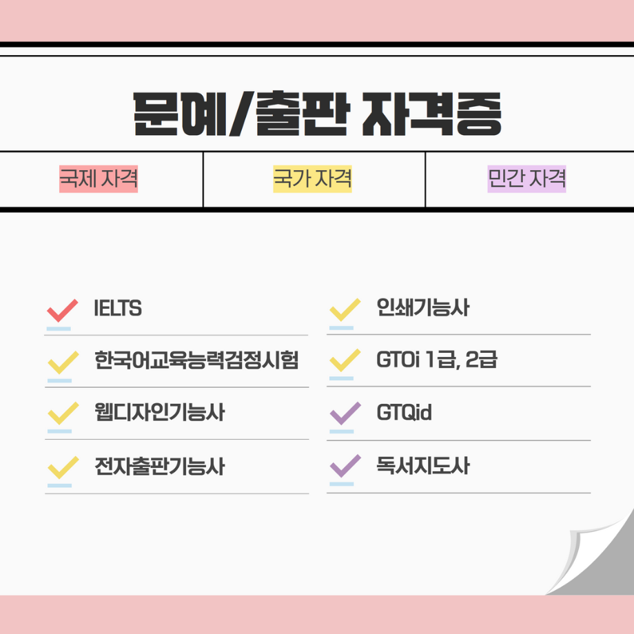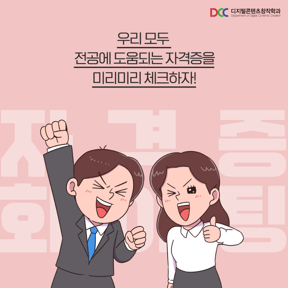 본문 시작 홈으로 MCC News 학과소개 교수소개 학과과정 MCC News MCC SNS 홈페이지가이드 학과 및 재학생 학과 및 재학생 교수 및 졸업생 미디어 정보통 학과 및 재학생 페이스북 트위터 프린트 미리 취득하면 도움 되는 자격증📝 디지털콘텐츠창작학과 5874 2023-04-07 문예,출판 관련 자격증을 알려드립니다! 자격증은 국제/국가/민간으로 나뉘며 총 6개의 자격증이 있습니다! 각 전공에 도움 되는 자격증을 미리 확인하여 취득할 수 있는 기회를 놓치지 마세요! 목록 이전🍭 오늘의 디콘 13탄 🍭 다음 🍭 오늘의 디콘 14탄 🍭 담당부서 : 미디어콘텐츠창작학과 담당자 : - 연락처 : 043-649-1741 최종수정일 : 2024-10-26 만족도조사 만족도 조사 이 페이지에서 제공하는 정보에 대하여 만족하시나요? 매우만족 만족 보통 불만족 매우불만족