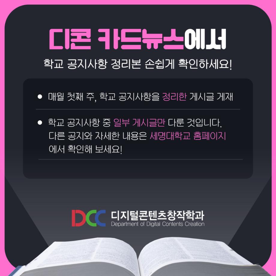 본문 시작 홈으로 MCC News 학과소개 교수소개 학과과정 MCC News MCC SNS 홈페이지가이드 학과 및 재학생 학과 및 재학생 교수 및 졸업생 미디어 정보통 학과 및 재학생 페이스북 트위터 프린트 세명대학교 홈페이지 공지사항 정리 디지털콘텐츠창작학과 3393 2023-07-07 매번 홈페이지 들어가기 귀찮은 분들을 위해 세명대학교 공지사항 요약본을 준비했습니다! 유익한 정보 얻어가시기 바랍니다! *공지사항 중 일부 게시글만 다룬 것입니다. 다른 공지사항이나 자세한 내용은 학교 홈페이지에서 확인 바랍니다 목록 이전🏫 강의실 Before & After 🏫 다음 🍭 오늘의 디콘 17탄 🍭 담당부서 : 미디어콘텐츠창작학과 담당자 : - 연락처 : 043-649-1741 최종수정일 : 2024-10-26 만족도조사 만족도 조사 이 페이지에서 제공하는 정보에 대하여 만족하시나요? 매우만족 만족 보통 불만족 매우불만족