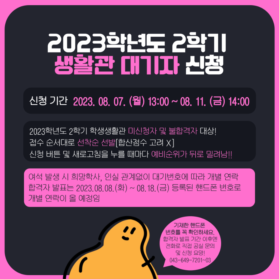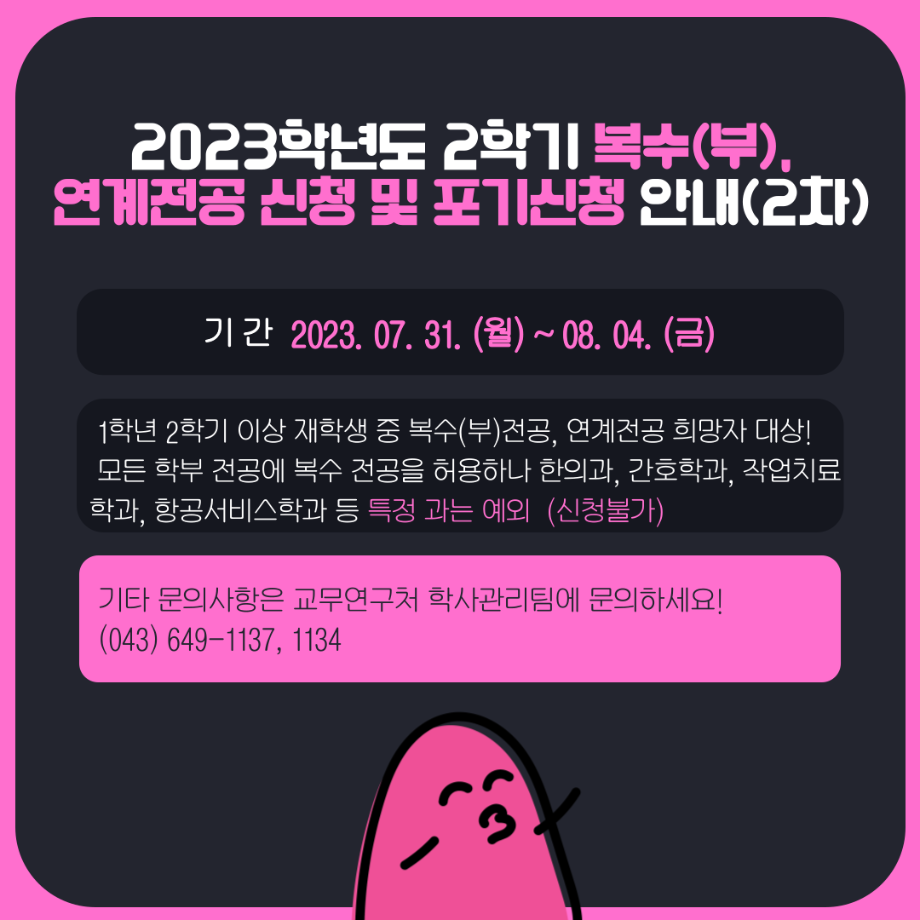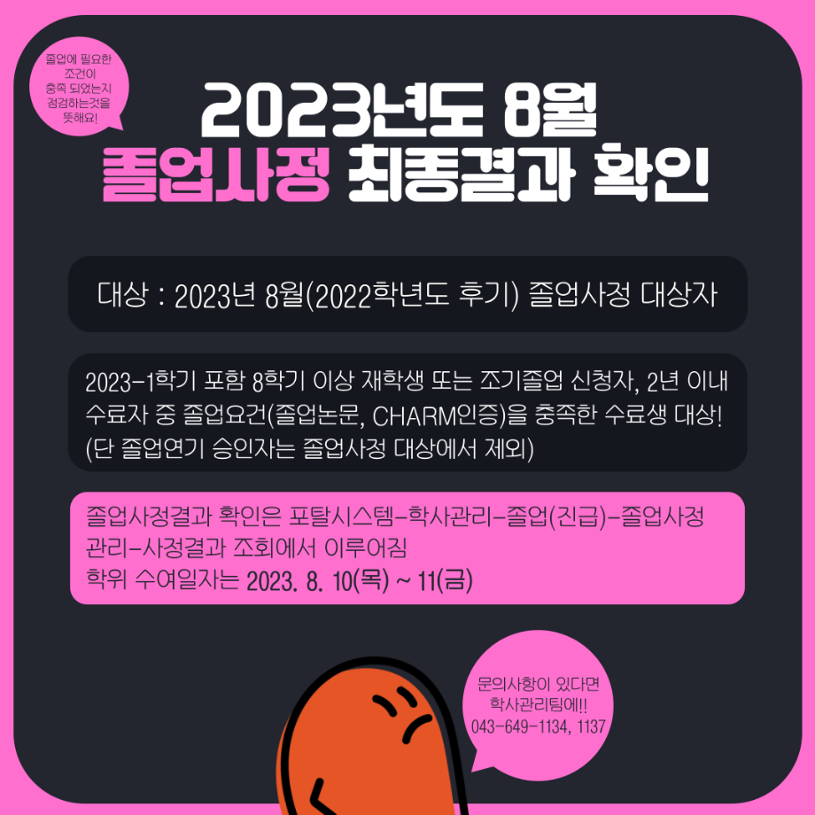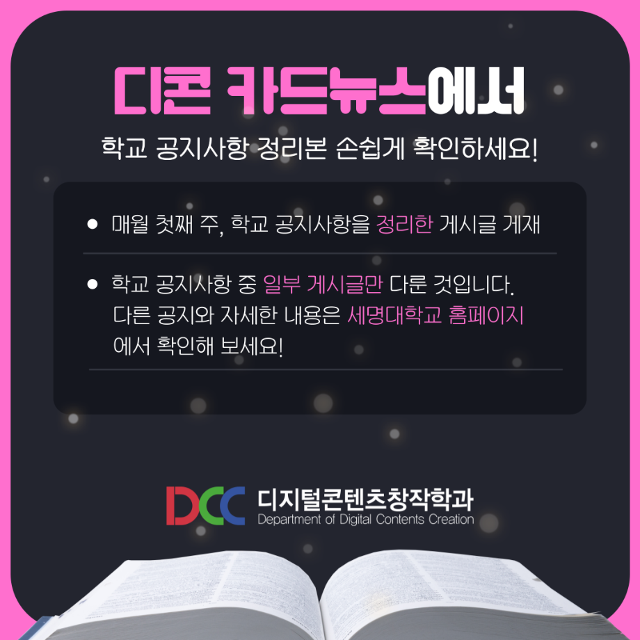 본문 시작 홈으로 MCC News 학과소개 교수소개 학과과정 MCC News MCC SNS 홈페이지가이드 학과 및 재학생 학과 및 재학생 교수 및 졸업생 미디어 정보통 학과 및 재학생 페이스북 트위터 프린트 세명대학교 홈페이지 공지사항 정리 디지털콘텐츠창작학과 4018 2023-08-02 매번 홈페이지 들어가기 번거로우신 분들을 위해 세명대학교 공지사항 요약본을 준비했습니다! 유익한 정보 얻어가시기 바랍니다! *공지사항 중 일부 게시글만 다룬 것입니다. 다른 공지사항이나 자세한 내용은 학교 홈페이지에서 확인 바랍니다 목록 이전📝디콘창 학생회 월말결산 다음 🍭 오늘의 디콘 19탄 🍭 담당부서 : 미디어콘텐츠창작학과 담당자 : - 연락처 : 043-649-1741 최종수정일 : 2024-10-26 만족도조사 만족도 조사 이 페이지에서 제공하는 정보에 대하여 만족하시나요? 매우만족 만족 보통 불만족 매우불만족