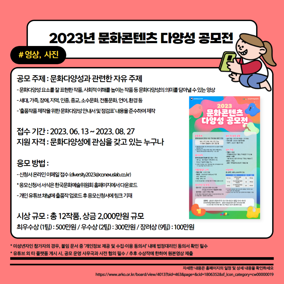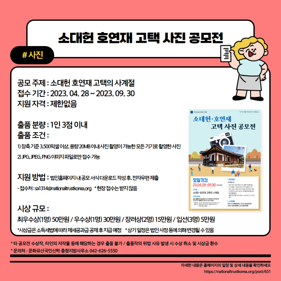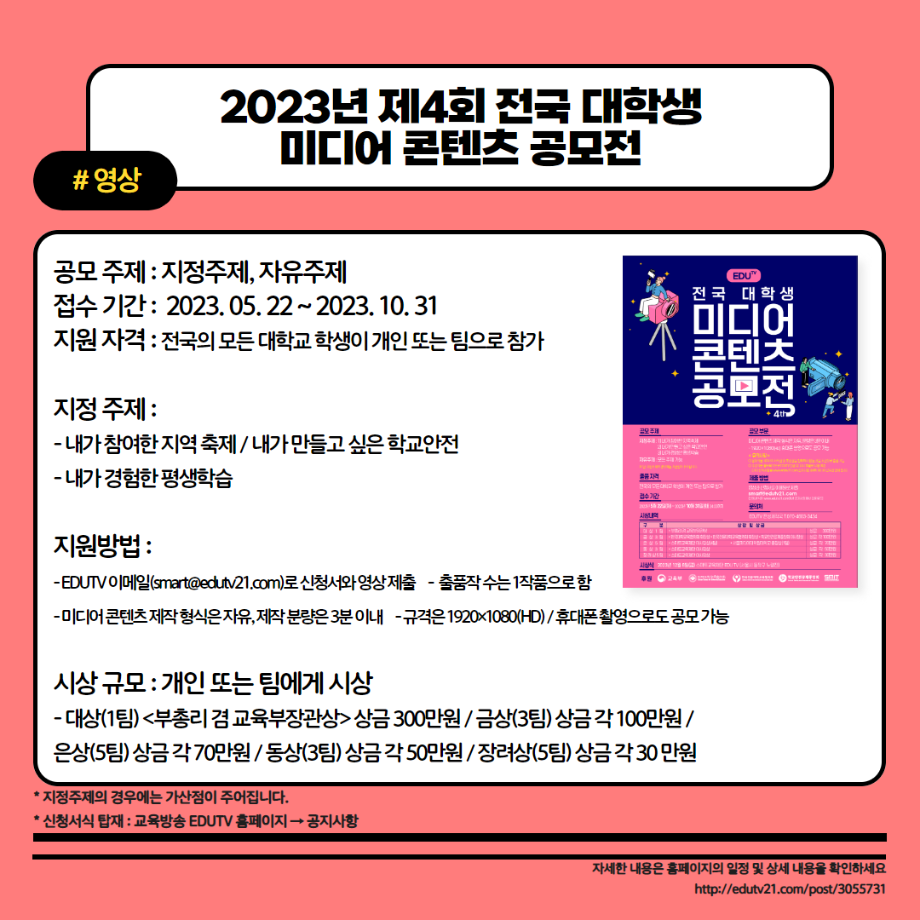 본문 시작 홈으로 MCC News 학과소개 교수소개 학과과정 MCC News MCC SNS 홈페이지가이드 학과 및 재학생 학과 및 재학생 교수 및 졸업생 미디어 정보통 학과 및 재학생 페이스북 트위터 프린트 23년도 교외 공모전 알려드려요‼ 3탄 디지털콘텐츠창작학과 3700 2023-08-14 23년도 영상, 디자인, 사진 분야의 공모전을 알려드립니다! 얼마 남지 않은 여름방학동안 공모전에 참여하면서 경험과 실력을 쌓을 수 있는 기회를 놓치지 마세요! 목록 이전📚디콘창이 알려주는 수강신청 안내📚 다음 이런 졸업작품도 있다고? "커뮤니케이션 통" 담당부서 : 미디어콘텐츠창작학과 담당자 : - 연락처 : 043-649-1741 최종수정일 : 2024-10-26 만족도조사 만족도 조사 이 페이지에서 제공하는 정보에 대하여 만족하시나요? 매우만족 만족 보통 불만족 매우불만족