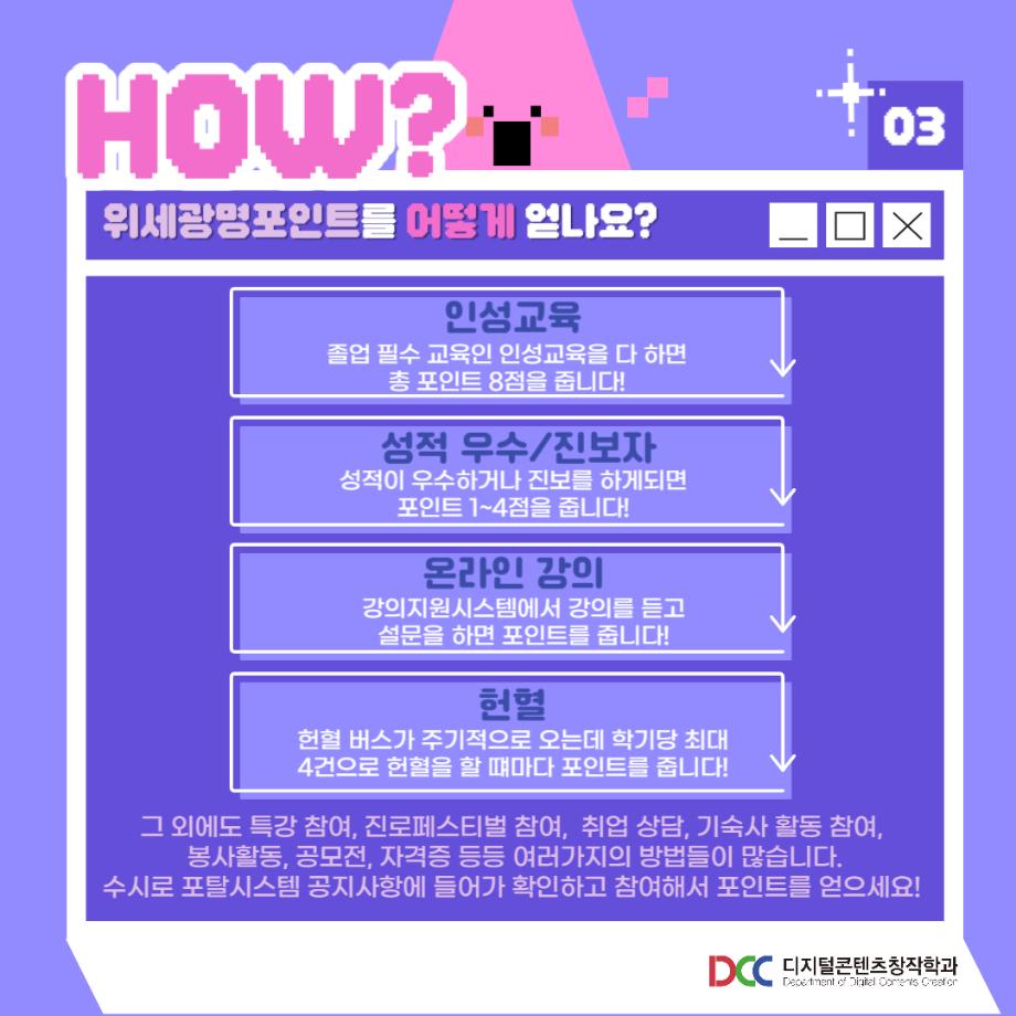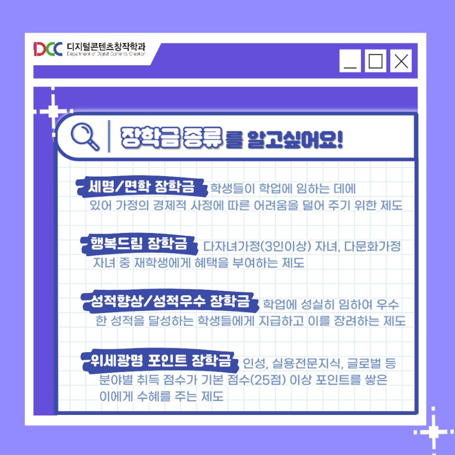 본문 시작 홈으로 MCC News 학과소개 교수소개 학과과정 MCC News MCC SNS 홈페이지가이드 학과 및 재학생 학과 및 재학생 교수 및 졸업생 미디어 정보통 학과 및 재학생 페이스북 트위터 프린트 장학금 받는 꿀팁🎓 디지털콘텐츠창작학과 6066 2023-10-20 장학금 받는 꿀팁🎓 학생회가 알려주는 장학금 받는 꿀팁❗ 장학금 종류뷰터 지급기간까지 알려드려요! 목록 이전학생회가 알려주는 재학생 할인 혜택 다음 디콘창 학생회 소개🤗 담당부서 : 미디어콘텐츠창작학과 담당자 : - 연락처 : 043-649-1741 최종수정일 : 2024-10-26 만족도조사 만족도 조사 이 페이지에서 제공하는 정보에 대하여 만족하시나요? 매우만족 만족 보통 불만족 매우불만족