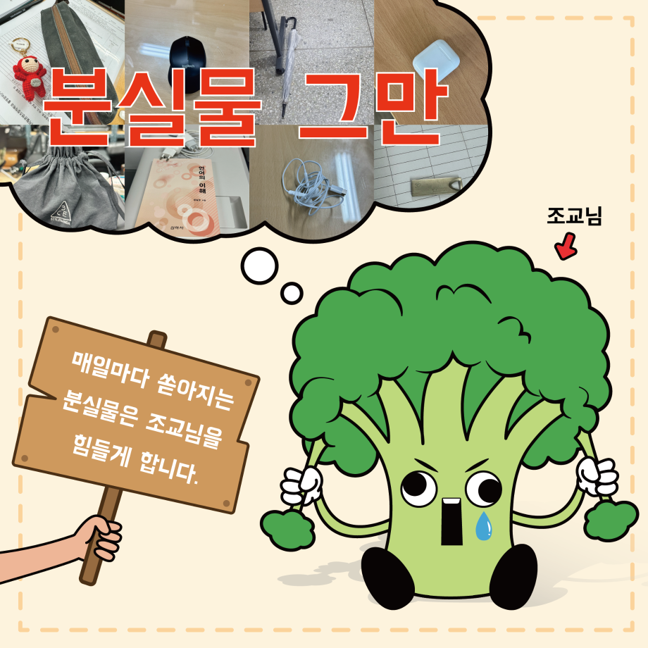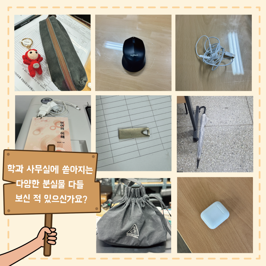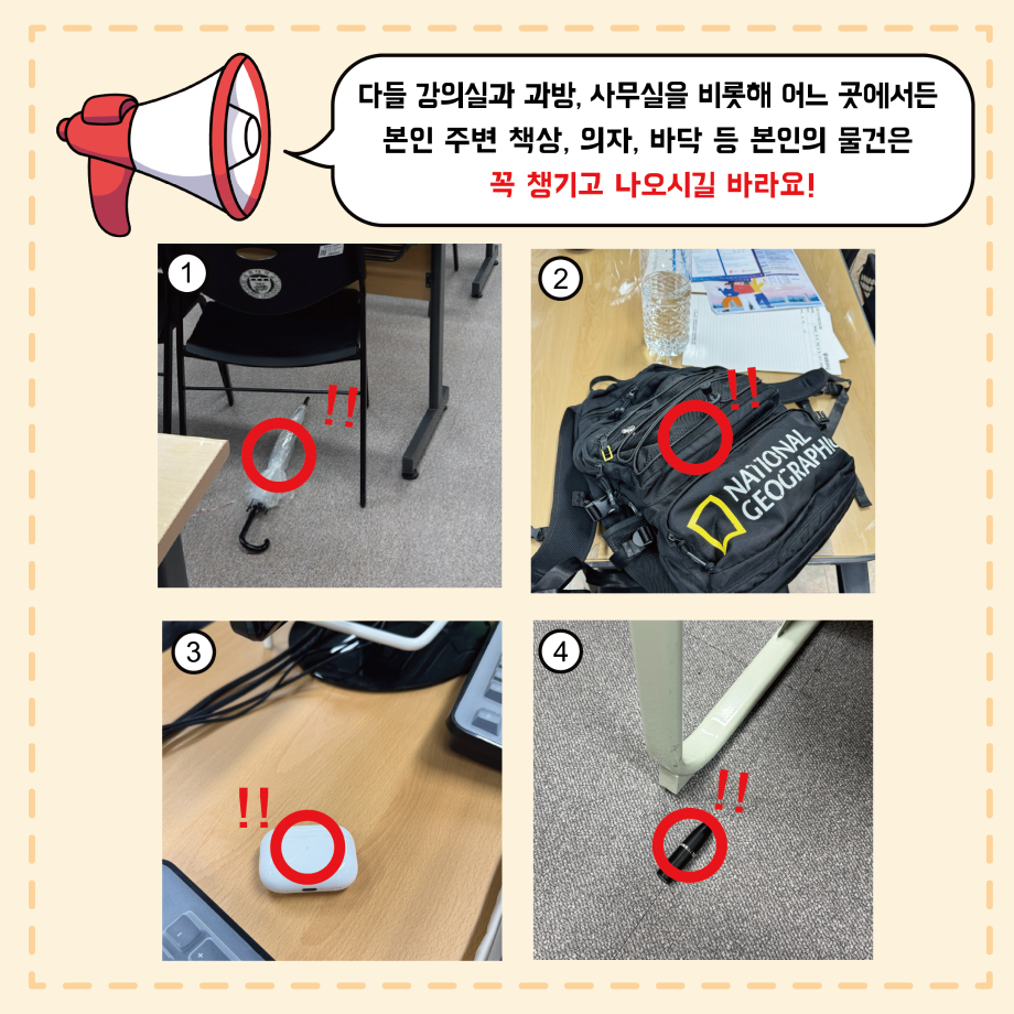 본문 시작 홈으로 MCC News 학과소개 교수소개 학과과정 MCC News MCC SNS 홈페이지가이드 학과 및 재학생 학과 및 재학생 교수 및 졸업생 미디어 정보통 학과 및 재학생 페이스북 트위터 프린트 MCC 내 물건은 내가 지키자! 미디어콘텐츠창작학과 2081 2024-10-24 학과 사무실에 쏟아지는 다양한 분실물 다들 보신 적 있으신가요? 매일마다 쏟아지는 분실물은 조교님을 힘들게 합니다. 다들 교실과 과방, 사무실을 비롯해 어느 곳에서든 본인 주변 책상, 의자, 바닥 등 본인의 물건은 꼭 챙기고 나오시길 바라요! 목록 이전2024년도 세명대학교 인문예술대학 문화콘텐츠 창작공모전 개최 다음 🚪MCC 추리 방탈출 "크라임씬"🔎🚪 담당부서 : 미디어콘텐츠창작학과 담당자 : - 연락처 : 043-649-1741 최종수정일 : 2024-10-26 만족도조사 만족도 조사 이 페이지에서 제공하는 정보에 대하여 만족하시나요? 매우만족 만족 보통 불만족 매우불만족