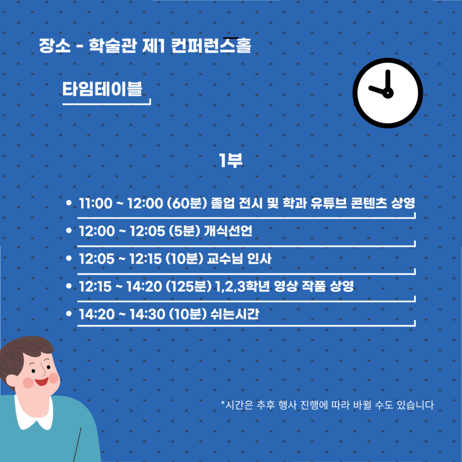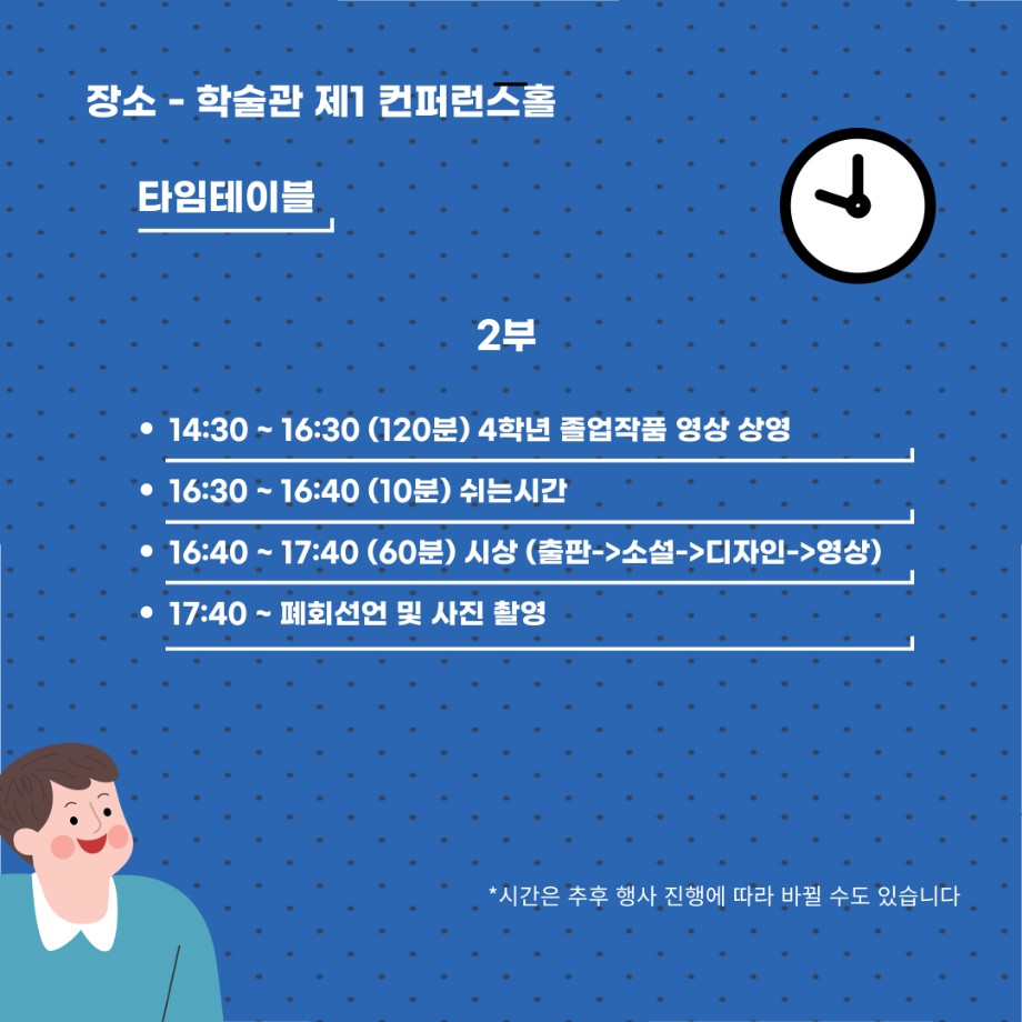 본문 시작 홈으로 MCC News 학과소개 교수소개 학과과정 MCC News MCC SNS 홈페이지가이드 학과 및 재학생 학과 및 재학생 교수 및 졸업생 미디어 정보통 학과 및 재학생 페이스북 트위터 프린트 🎊제22회 DCC 페스티벌🎊 미디어콘텐츠창작학과 2509 2024-11-27 디지털콘텐츠창작학과에서 학기 마지막 행사인 DCC페스티벌을 진행합니다! DCC 페스티벌은 1년동안 학과 학우분들이 제작한 영상, 소설, 디자인, 출판등을 전시 및 상영하는 행사이며 학과의 가장 큰 행사입니다. 일시 - 2024년 12월 3일 화요일 11시 장소 - 학술관 제1컨퍼런스홀 디지털콘텐츠창작학과 이름으로 하는 마지막 행사이자 학우여러분들의 1년동안의 과정, 성과를 볼 수 있는 행사이니 많은 관심과 참여 부탁드립니다! 목록 이전🕵🏻♂미디어콘텐츠창작학과 추리 방탈출🔎 다음 DCC 콘텐츠 페스티벌이 무사히 끝났습니다. 담당부서 : 미디어콘텐츠창작학과 담당자 : - 연락처 : 043-649-1741 최종수정일 : 2024-10-26 만족도조사 만족도 조사 이 페이지에서 제공하는 정보에 대하여 만족하시나요? 매우만족 만족 보통 불만족 매우불만족