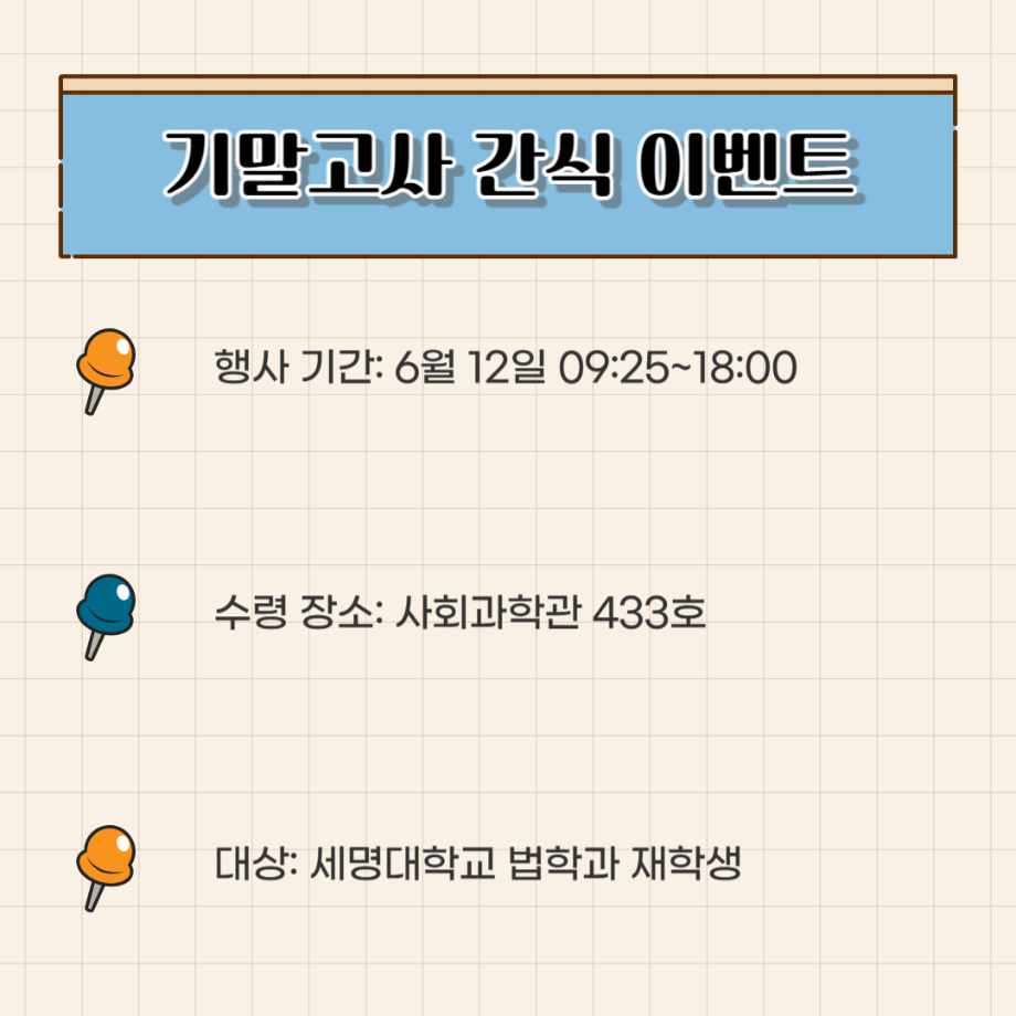 본문 시작 홈으로 커뮤니티 학과안내 교수소개 학과과정 커뮤니티 홈페이지가이드 학과사진첩 공지사항 취업정보 학과사진첩 학과행사 동아리 학생회 교우소식 학과사진첩 페이스북 트위터 프린트 법학과 간식 이벤트🍪 법학과 1578 2025-06-12 법학과 학생회 "다온" 에서 시험으로 지친 학생들을 위해 간식이벤트를 준비했습니다:) 목록 이전2025학년도 법학과 학술캠프 다음 법학과 선배들의 진로 현황 담당부서 : 법학과 담당자 : - 연락처 : 043-649-1764 최종수정일 : 2024-10-26 만족도조사 만족도 조사 이 페이지에서 제공하는 정보에 대하여 만족하시나요? 매우만족 만족 보통 불만족 매우불만족