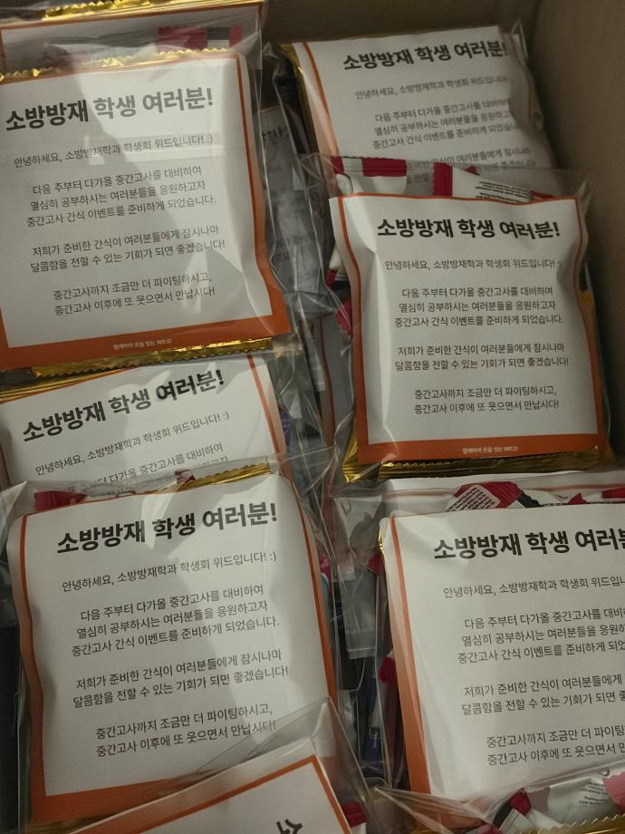 본문 시작 홈으로 커뮤니티 학과소개 교수소개 전공과정 커뮤니티 홈페이지가이드 학과행사 학과공지 채용정보 학사일정 학과행사 학생회 동아리 소방방재학과의 자랑 궁금합니다 수험생 Q&A 학과행사 페이스북 트위터 프린트 2026학년도 1학기 중간고사 간식 이벤트 소방방재학과 31 2026-04-14 2026년 4월 14일 화요일 안녕하세요, 세명대학교 소방방재학과 제21대 학생회 위드입니다! 공학관 209호 앞에서 17시 30분부터 18시까지 2026학년도 1학기 중간고사 간식 이벤트를 진행하였습니다! 수령하지 못하신 분들은 15일에 걸쳐 수령하실 수 있도록 도와드릴 예정입니다. 중간고사까지 다들 파이팅 하시고 좋은 결과 있으시길 바라겠습니다! 목록 이전캡스톤디자인 작품 중앙시장 번영회에 기증 담당부서 : 소방방재학과 담당자 : - 연락처 : 043-649-1787 최종수정일 : 2024-10-26 만족도조사 만족도 조사 이 페이지에서 제공하는 정보에 대하여 만족하시나요? 매우만족 만족 보통 불만족 매우불만족