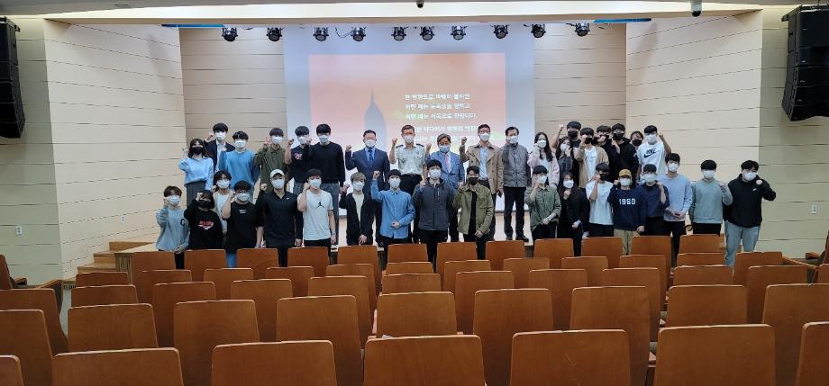 본문 시작 홈으로 커뮤니티 학과소개 교수소개 전공과정 커뮤니티 홈페이지가이드 학과행사 학과공지 채용정보 학사일정 학과행사 동아리 소방방재학과의 자랑 궁금합니다 수험생 Q&A 학과행사 페이스북 트위터 프린트 2021학년도 1학기 "제 3대 소방청장 신열우 청장 초청 특별 강연" 소방방재학과 5006 2021-06-22 2021년 5월 18일 10시부터 학술관 112호에서 신열우 소방청장을 모시고 '소방의 현재와 미래'라는 주제로 특별 초청 강연을 개최했다. 신열우 소방청장님은 소방 조직체계의 변천과 역학, 대내외 소방환경, 최근 주요 정책방향 등에 관한 내용을 알기 쉽고 재미있게 강연하였으며, 참석한 50여명의 재학생들에게 큰 호응을 얻었다. 목록 이전2020년 김준경 교수님 은퇴 기념 고별 강연 다음 건설환경시험 연구원 견학 담당부서 : 소방방재학과 담당자 : - 연락처 : 043-649-1787 최종수정일 : 2024-10-26 만족도조사 만족도 조사 이 페이지에서 제공하는 정보에 대하여 만족하시나요? 매우만족 만족 보통 불만족 매우불만족