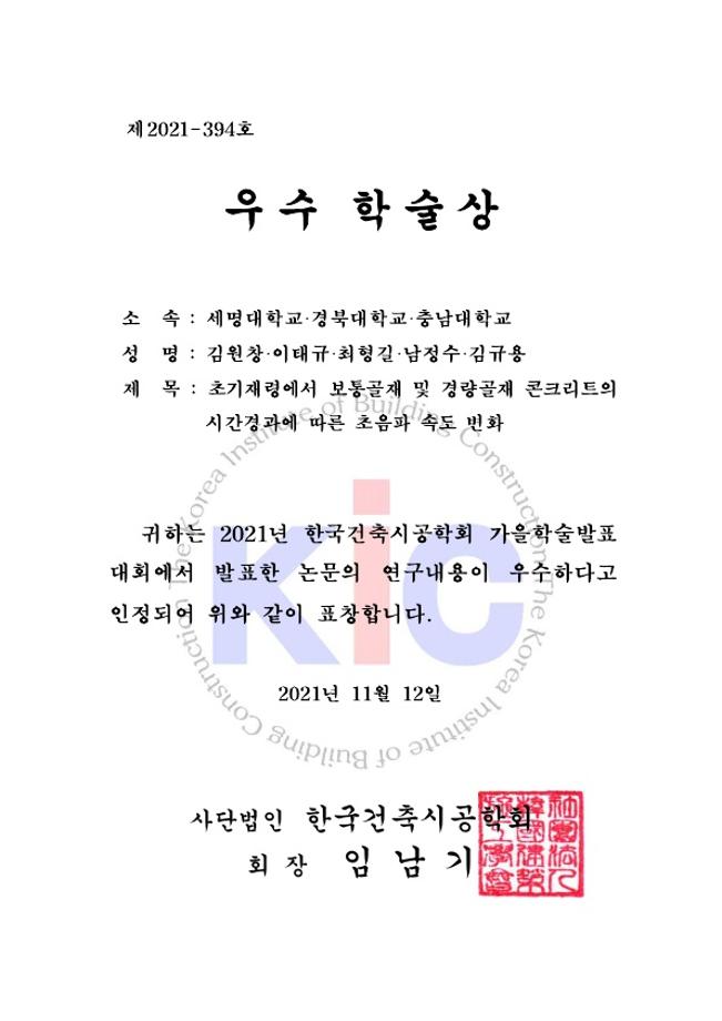 세명대학교(총장직무대행 권동현) 소방방재학과(학과장 정해영) 건설방재연구실(지도교수 이태규)이 지난 11월 12일 한국건축시공학회 주관 가을학술발표 대회에서 우수학술상을 수상했다.