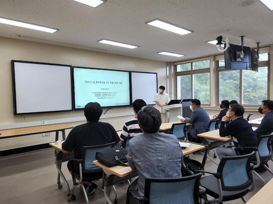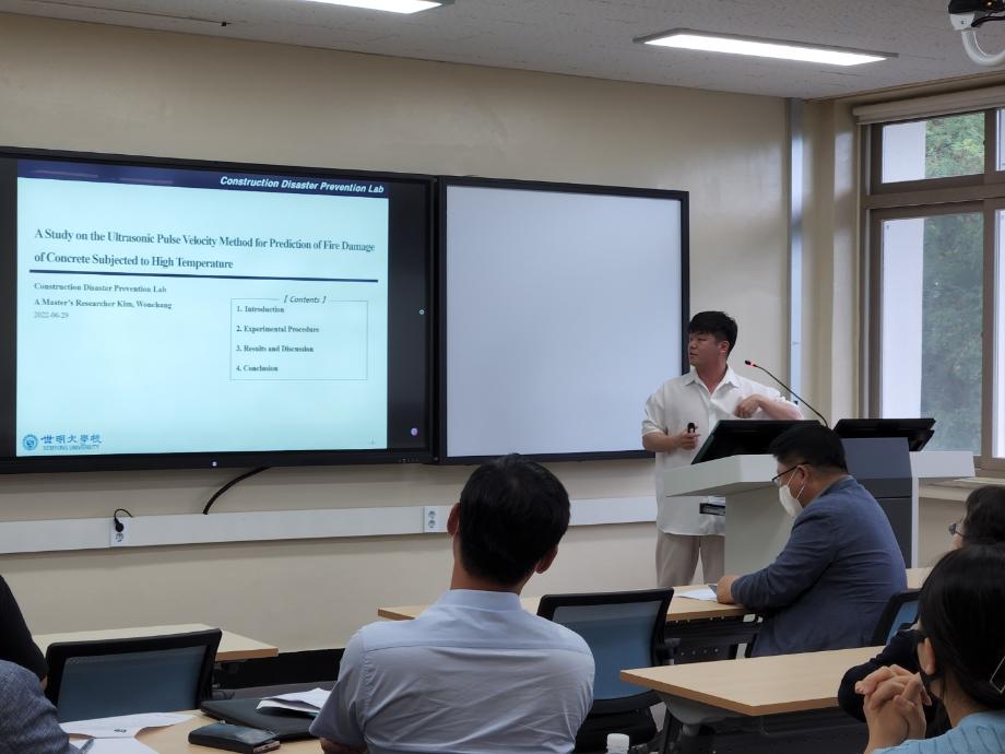 연합 세미나에서는 세명대학교 소방 IT 융합연구실의 최수기 학생, 강원대학교 방재전문대학원 김승준 학생, 세명대학교 건설방재연구실의 김원창 학생 순서로 연구실 소개 및 세미나 발표가 진행되었습니다.
