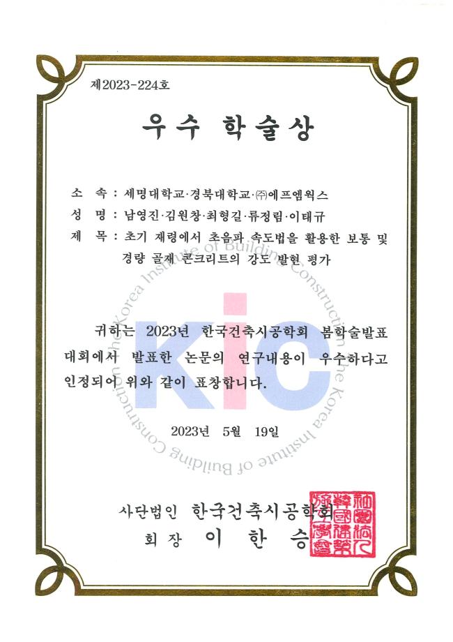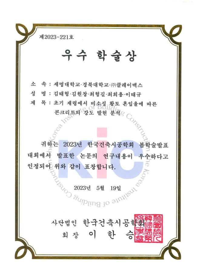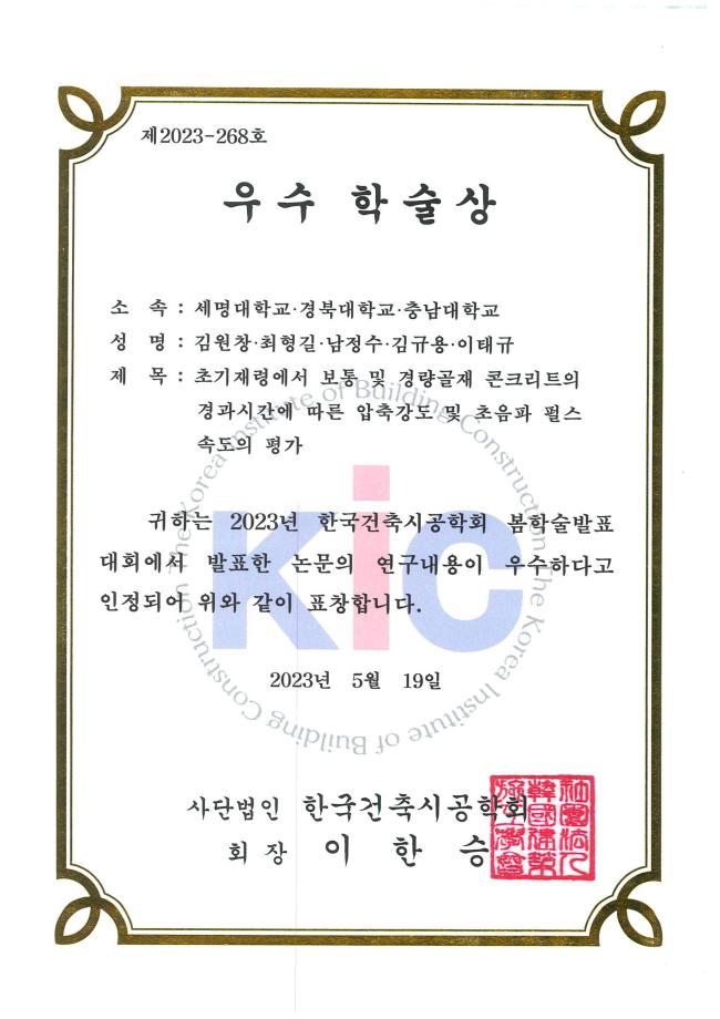 또한 건설방재연구실 박사과정 김원창, 석사과정 김태형, 석사과정 남영진 연구원이 우수논문발표상을 수상하는 쾌거를 이뤘습니다.