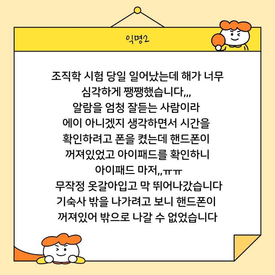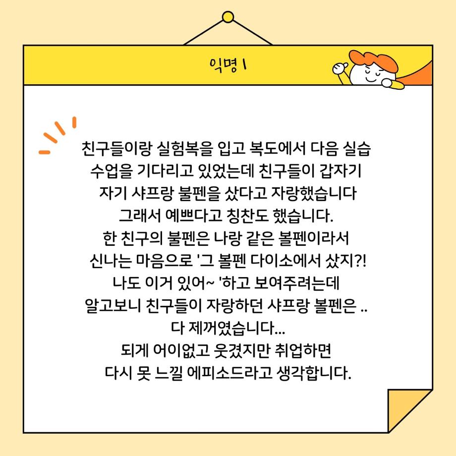 본문 시작 학교 에피소드 이벤트 임상병리학과 1984 2024-05-27 안녕하세요 16기 학생회입니다☺️ 개교기념일 기념 이벤트 주제인 ‘학교에서 있었던 재미있는 에피소드’ 3분을 선정하였습니다! 익명 1,2,3분께는 배달의민족 상품권을 증정해 드릴 예정입니다. 다음 이벤트도 많이 기대해 주세요:) 목록 이전과대 회식 다음 충북도페스티벌 in 증평 회식 담당부서 : 임상병리학과 담당자 : - 연락처 : 043-649-1537 최종수정일 : 2024-10-26 만족도조사 만족도 조사 이 페이지에서 제공하는 정보에 대하여 만족하시나요? 매우만족 만족 보통 불만족 매우불만족