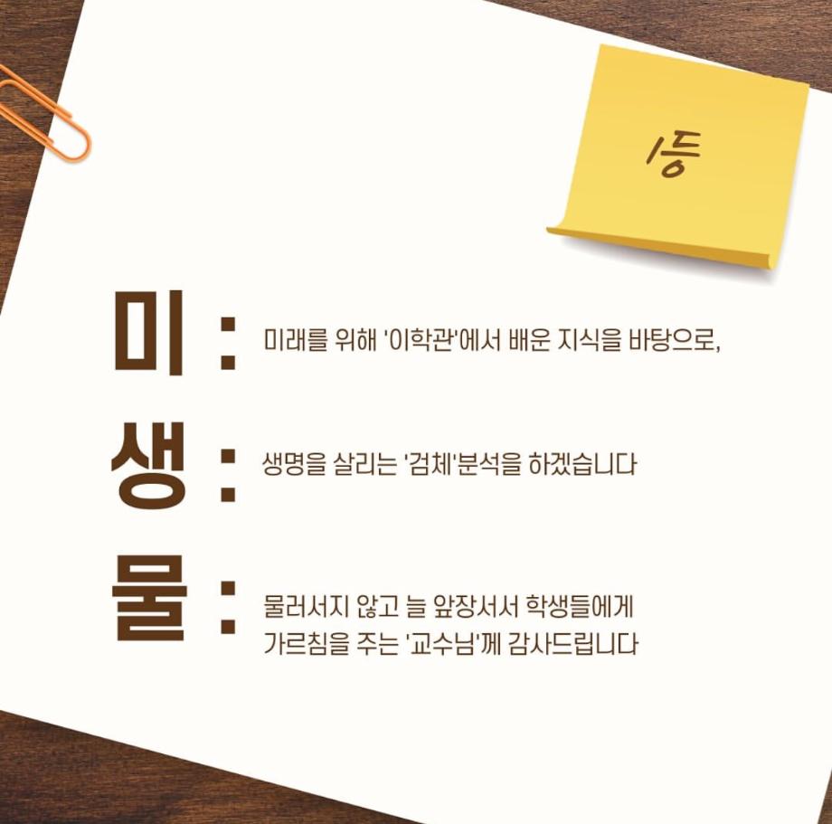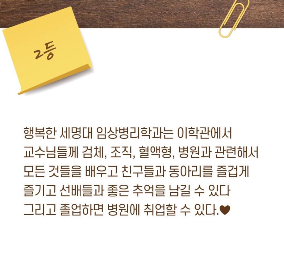 본문 시작 9월 학과 문장만들기 임상병리학과 2311 2024-10-03 9월 학과 개설된 달 기념 3행시, 문장 만들기 이벤트 우수작 총 15개를 선정하였지만 사진 제한이 있어 다 올리지는 못하였습니다 ! 상품은 다음 주 중으로 증정해 드릴 예정입니다 :) 이번 이벤트에 많은 관심을 가져주셔서 감사합니다. 다음에도 좋은 이벤트가 기다리고 있으니 기대해주시길 바랍니다 ! 목록 이전헌혈 버스 다음 중간고사 학용품 이벤트 담당부서 : 임상병리학과 담당자 : - 연락처 : 043-649-1537 최종수정일 : 2024-10-26 만족도조사 만족도 조사 이 페이지에서 제공하는 정보에 대하여 만족하시나요? 매우만족 만족 보통 불만족 매우불만족