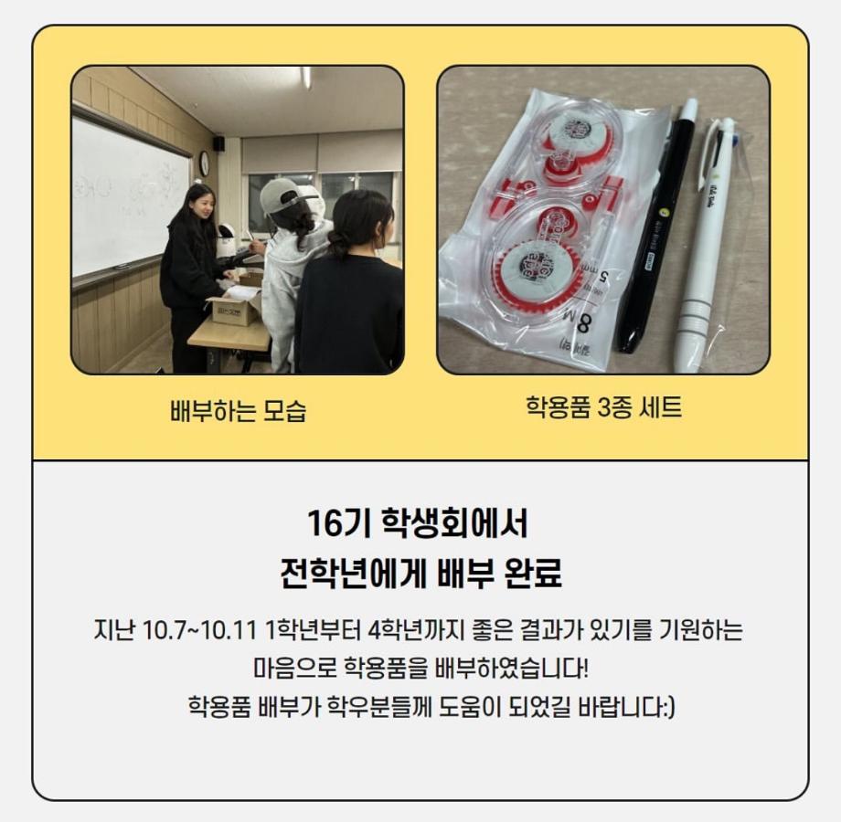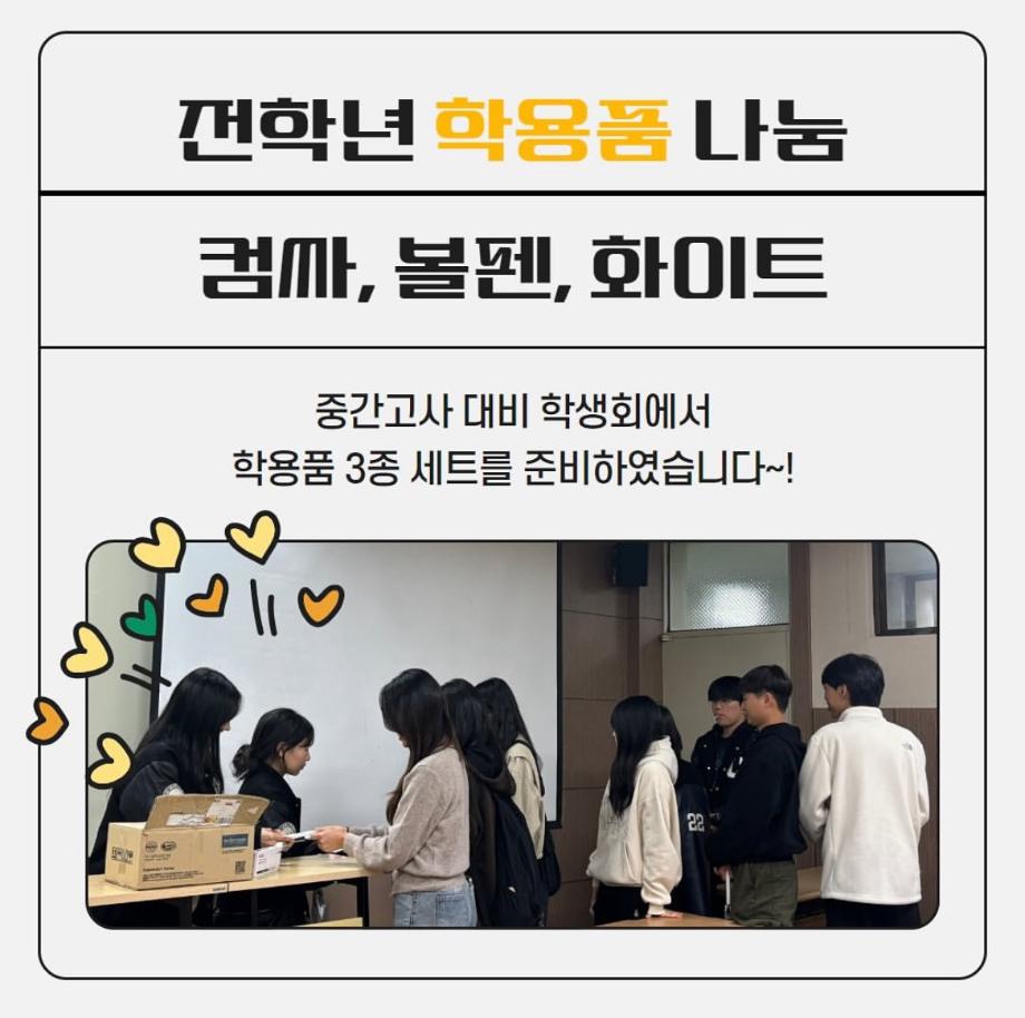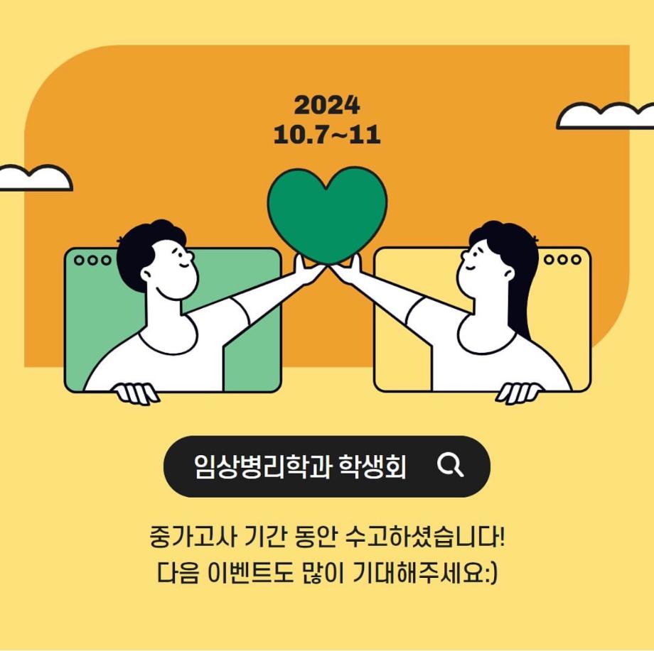 본문 시작 중간고사 학용품 이벤트 임상병리학과 3118 2024-10-22 지난 10/7~10/11 전 학년 좋은 결과가 있기를 기원하는 마음으로 학용품 이벤트를 진행하였습니다 ! 이번 학용품 배부가 학우분들께 도움이 되었길 바랍니다 ! 중간고사 기간 동안 수고하셨습니다 ! 다음 이벤트도 많이 기대해 주세요 :) 목록 이전9월 학과 문장만들기 다음 할로윈 사탕 이벤트 담당부서 : 임상병리학과 담당자 : - 연락처 : 043-649-1537 최종수정일 : 2024-10-26 만족도조사 만족도 조사 이 페이지에서 제공하는 정보에 대하여 만족하시나요? 매우만족 만족 보통 불만족 매우불만족