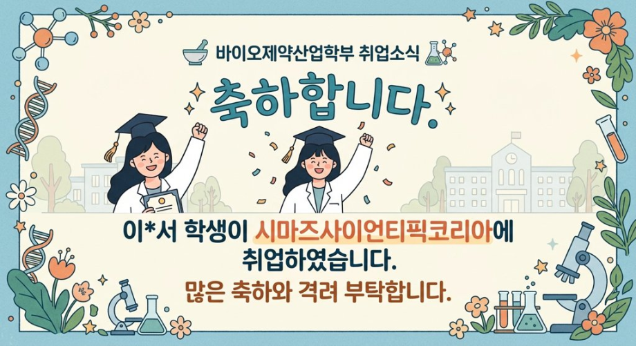 본문 시작 홈으로 학부자료실 학부소개 교육과정 학부공지게시판 학부자료실 홈페이지가이드 학부행사 및 사진게시판 학부행사 및 사진게시판 학생회 소개 학부행사 및 사진게시판 페이스북 트위터 프린트 축하합니다. 이*서 학생이 시마즈사이언티픽코리아에 취업하였습니다. 바이오제약산업학부 18 2026-04-27 축하합니다. 이*서 학생이 시마즈사이언티픽코리아에 취업하였습니다. 목록 이전축하합니다. 추*경 학생이 라이프 슈티컬에 취업하였습니다. 다음 2026 자기설계 해외배낭연수 설명회 시행 안내 담당부서 : 바이오제약산업학부 담당자 : - 연락처 : 043-649-1729 최종수정일 : 2024-10-26 만족도조사 만족도 조사 이 페이지에서 제공하는 정보에 대하여 만족하시나요? 매우만족 만족 보통 불만족 매우불만족