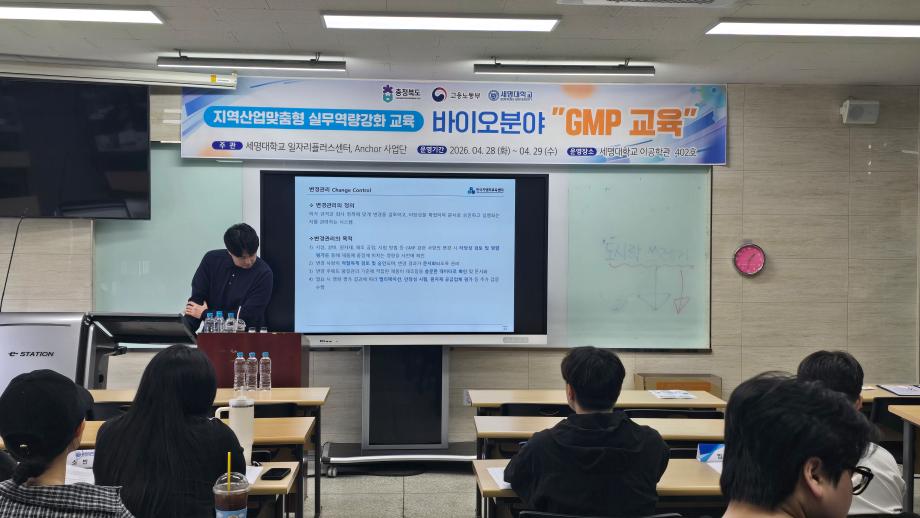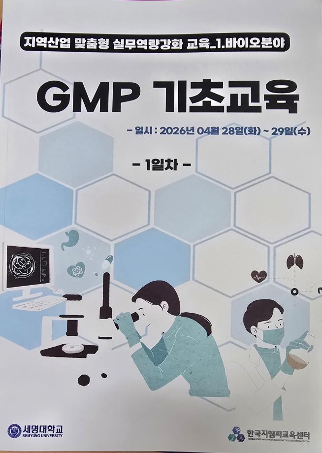 본문 시작 홈으로 학부자료실 학부소개 교육과정 학부공지게시판 학부자료실 홈페이지가이드 학부행사 및 사진게시판 학부행사 및 사진게시판 학생회 소개 학부행사 및 사진게시판 페이스북 트위터 프린트 GMP 기초교육 실시 바이오제약산업학부 6 2026-04-28 지역산업 맞춤형 실무역량강화교육_1. 바이오분야 주관: 세명대학교 일자리플러스센터, Anchor 사업단 주최: 세명대학교 바이오제약산업학부 교육기관: 한국지엠피교육센터 목록 이전2026 세명진로페스티벌 안내 담당부서 : 바이오제약산업학부 담당자 : - 연락처 : 043-649-1729 최종수정일 : 2024-10-26 만족도조사 만족도 조사 이 페이지에서 제공하는 정보에 대하여 만족하시나요? 매우만족 만족 보통 불만족 매우불만족