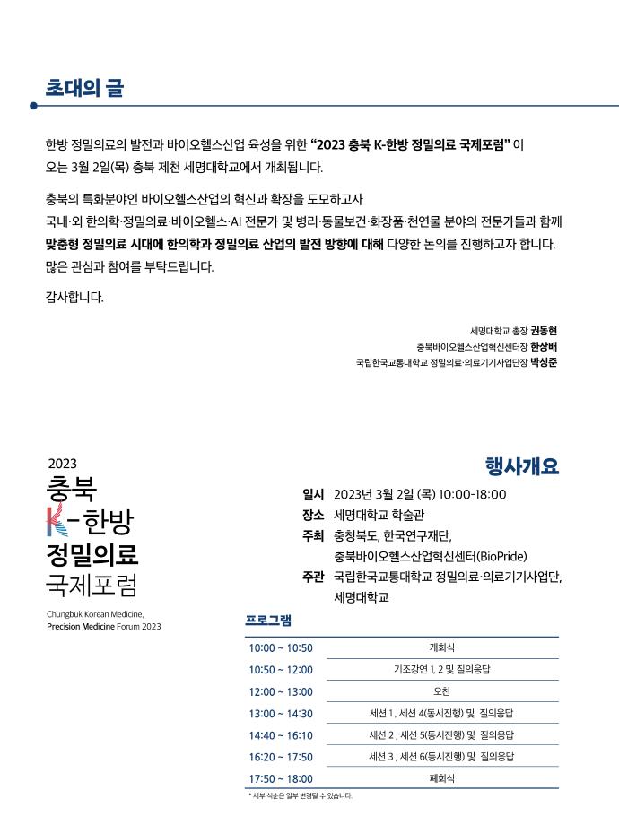 본문 시작 홈으로 학부자료실 학부소개 교육과정 학부공지게시판 학부자료실 홈페이지가이드 학부행사 및 사진게시판 학부행사 및 사진게시판 학생회 소개 학부행사 및 사진게시판 페이스북 트위터 프린트 2023 충북 K-한방 정밀의료 국제포럼 안내 바이오제약산업학부 3840 2023-02-17 2023 충북 K-한방 정밀의료 국제포럼 안내 목록 이전바이오제약산업학부 29회 학위수여식 다음 바이오제약산업학부 조순현 교수님 정년퇴임기념 특별세미나 담당부서 : 바이오제약산업학부 담당자 : - 연락처 : 043-649-1729 최종수정일 : 2024-10-26 만족도조사 만족도 조사 이 페이지에서 제공하는 정보에 대하여 만족하시나요? 매우만족 만족 보통 불만족 매우불만족