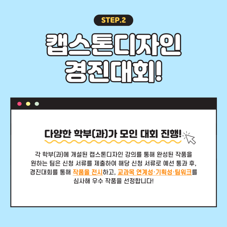 본문 시작 홈으로 학부자료실 학부소개 교육과정 학부공지게시판 학부자료실 홈페이지가이드 학부행사 및 사진게시판 학부행사 및 사진게시판 학생회 소개 학부행사 및 사진게시판 페이스북 트위터 프린트 캡스톤디자인 (입학관리본부) 바이오제약산업학부 3428 2023-11-17 캡스톤디자인 (입학관리본부) 목록 이전꿈설계학기 (입학관리본부) 다음 1824 프로젝트 (입학관리본부) 담당부서 : 바이오제약산업학부 담당자 : - 연락처 : 043-649-1729 최종수정일 : 2024-10-26 만족도조사 만족도 조사 이 페이지에서 제공하는 정보에 대하여 만족하시나요? 매우만족 만족 보통 불만족 매우불만족