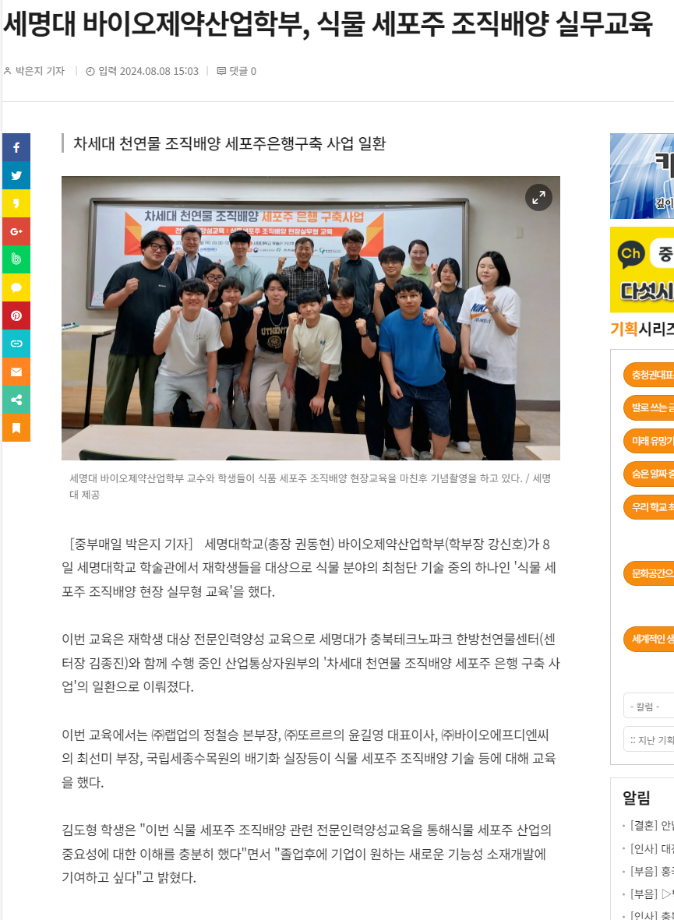 [중부매일 박은지 기자] 세명대학교(총장 권동현) 바이오제약산업학부(학부장 강신호)가 8일 세명대학교 학술관에서 재학생들을 대상으로 식물 분야의 최첨단 기술 중의 하나인 '식물 세포주 조직배양 현장 실무형 교육'을 했다.
