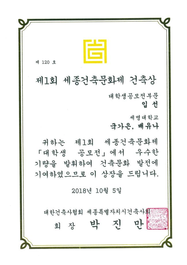 본문 시작 홈으로 커뮤니티 학과소개 교수소개 교육과정 학과 행사 및 활동 커뮤니티 홈페이지가이드 페이스북 트위터 프린트 제1회 세종건축문화제 건축상 수상 건축공학과 10808 2018-10-15 제1회 세종건축문화제 건축상 대학생공모전부문 입선 성명: 국가은, 배유나 목록 이전2017 한국건설관리학회 정기학술발표대회 우수논문상 수상 다음 전국대학생 학술발표대회 논문 부분 수상 만족도조사 만족도 조사 이 페이지에서 제공하는 정보에 대하여 만족하시나요? 매우만족 만족 보통 불만족 매우불만족