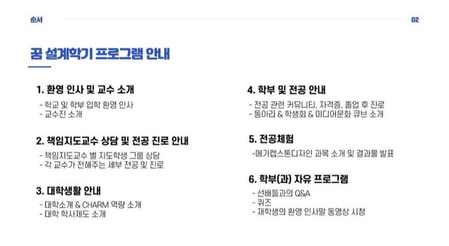 본문 시작 홈으로 학부소식 학부소개 교육과정 학부소식 커뮤니티 홈페이지가이드 학부행사 공지사항 학사일정 학부행사 미문뉴스 미문한컷 포토갤러리 학부행사 페이스북 트위터 프린트 [2월의 행사] 꿈설계학기 미디어문화학부 2459 2022-07-01 2022학년도 미디어문화학부 꿈 설계학기가 성황리에 마무리 되었습니다! Q&A와 퀴즈에 열정적으로 참여해주신 22학번 신입생 여러분들, 전공체험 소개를 맡아주신 선배님 감사합니다. 비대면으로 진행되어 아쉬운 부분도 있었지만, 모두에게 유익하고 즐거운 시간이 되었기를 바랍니다. 건강한 모습으로 학교에서 만날 수 있길 기대하고 있겠습니다! 신입생 여러분들의 학교 및 학부 생활을 응원합니다. 목록 이전[12월의 행사]미디어문화학부 국제인증 ACP일러스트 자격증 특강 프로그램 운영 다음 [3월의 행사] 신입생 환영회 담당부서 : 미디어문화학부 담당자 : - 연락처 : 043-649-1760 최종수정일 : 2024-10-26 만족도조사 만족도 조사 이 페이지에서 제공하는 정보에 대하여 만족하시나요? 매우만족 만족 보통 불만족 매우불만족