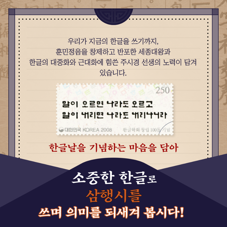 본문 시작 홈으로 학부소식 학부소개 교육과정 학부소식 커뮤니티 홈페이지가이드 학부행사 공지사항 학사일정 학부행사 미문뉴스 미문한컷 포토갤러리 학부행사 페이스북 트위터 프린트 수시 지원자를 위한 한글날 N행시 행사 미디어문화학부 3899 2022-10-13 미디어문화학부에서는 한글날 제 576돌을 맞이하여 학부 자체행사로 한글날 N행시 행사를 진행하고 있습니다! 이번에 미디어문화학부 수시 지원자만을 위해 3행시 행사도 추가로 진행하고 있습니다! 3행시 선정 대상자를 위한 소정의 상품도 준비되어 있습니다:) 목록 이전[10월의 행사] 한글날 N행시 행사 다음 2022학년도 미디어문화학부 MT 담당부서 : 미디어문화학부 담당자 : - 연락처 : 043-649-1760 최종수정일 : 2024-10-26 만족도조사 만족도 조사 이 페이지에서 제공하는 정보에 대하여 만족하시나요? 매우만족 만족 보통 불만족 매우불만족