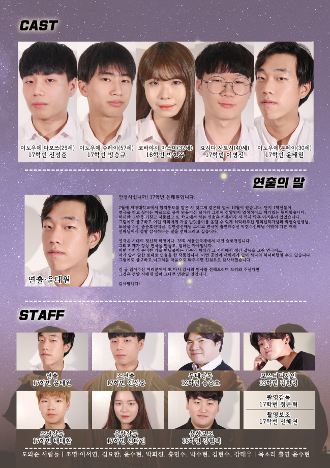 본문 시작 홈으로 커뮤니티 학과소개 교수소개 학과과정 커뮤니티 작품DB 서울대학로 민송아트홀 홈페이지가이드 사진자료실 학과공지 전공자료실 사진자료실 사진자료실 페이스북 트위터 프린트 [공연영상학과] 1학년 하계 워크숍 "가을 반딧불이" 공연영상학과 10571 2017-12-11 - 공연일시: 2017년 10월 11일 오후 7시 태양아트홀 - 정의신 作 - 지도교수: 이정하 - 학생연출: 윤태원 - 배우: 박현주, 진성준, 이병진, 방승규, 윤태원 - 포스터디자인,촬영: 김한정 - 음향디자인,OP: 강현택 - 조명디자인,OP: 전다린, 배대환 - 스텝: 송준호, 정은혁, 신혜연 목록 이전[공연영상학과] 2학년 하계 워크숍 '베니스의 상인' 다음 세명대학교 공연영상학과 제 10회 졸업공연 '트루 웨스트' 담당부서 : 공연영상학과 담당자 : - 연락처 : 043-649-1429 최종수정일 : 2024-10-26 만족도조사 만족도 조사 이 페이지에서 제공하는 정보에 대하여 만족하시나요? 매우만족 만족 보통 불만족 매우불만족