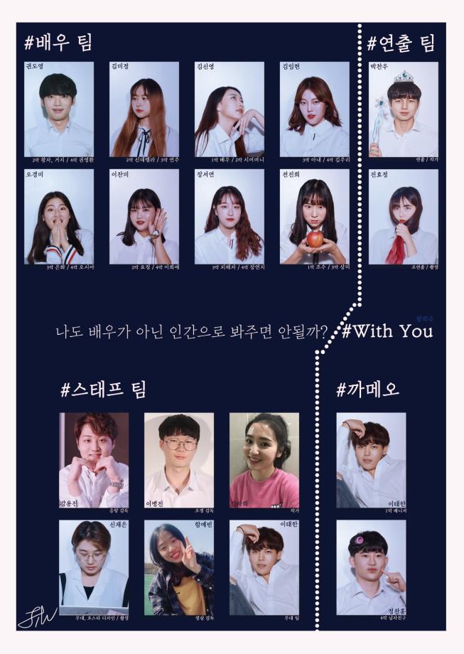본문 시작 홈으로 커뮤니티 학과소개 교수소개 학과과정 커뮤니티 작품DB 서울대학로 민송아트홀 홈페이지가이드 사진자료실 학과공지 전공자료실 사진자료실 사진자료실 페이스북 트위터 프린트 [공연영상학과] 2018년 하계프로젝트 창작극 #With you 공연영상학과 7671 2018-10-04 하계프로젝트 - 창작극 "#With you" - 공연일시: 2018년 10월 4일 오후 7시 태양아트홀 - 연출/작가: 박찬우 - 조연출: 진효정 - 작가: 김하희 - 무대감독: 이해창 - 무대/포스터디자인: 신재은 - 조명감독: 이병진 - 음향오퍼: 강용진 - 배우: 권도영, 김미정, 김신영, 김임현, 이찬미, 오경미, 장서연, 전진희 목록 이전[공연영상학과] 제 11회 졸업작품 "야끼니쿠드래곤" 다음 [공연영상학과] 2018년 하계프로젝트 버스를놓치다 담당부서 : 공연영상학과 담당자 : - 연락처 : 043-649-1429 최종수정일 : 2024-10-26 만족도조사 만족도 조사 이 페이지에서 제공하는 정보에 대하여 만족하시나요? 매우만족 만족 보통 불만족 매우불만족