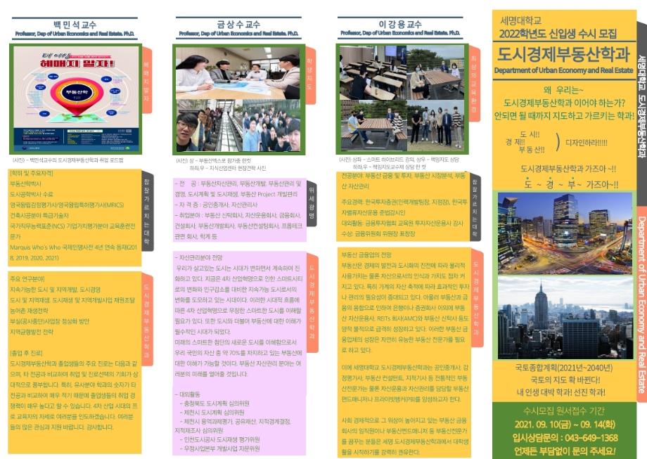 본문 시작 홈으로 학과 소식 학과소개 취업 및 진로 언론 및 보도 학과 소식 대학원 홈페이지가이드 행사사진게시판 행사사진게시판 공지사항 일반자료실 강의자료실 부동산학보 동아리 행사사진게시판 페이스북 트위터 프린트 학과명칭 변경 도시경제부동산학과 홍보리플렛 부동산학과 3605 2021-06-16 세명대학교 부동산학과가 2022학년도 '도시경제부동산학과'로 새롭게 탄생합니다. 세명대학교 부동산학과가 2022년 '도시경제부동산학과'로 새롭게 탄생합니다. 격변하는시대에 맞춰 전문적이고 수준높은 교육을 위하여 도시경제부동산학과가 여러분들과 함께 할 것입니다. 작성자 : 부동산학과 조교 목록 이전학과장님과 다빈학생회! 다음 한국법이론실무학회활동하는 도경제부동산학과 김상진교수 담당부서 : 부동산지적학과 담당자 : - 연락처 : 043-649-1784 최종수정일 : 2024-10-26 만족도조사 만족도 조사 이 페이지에서 제공하는 정보에 대하여 만족하시나요? 매우만족 만족 보통 불만족 매우불만족