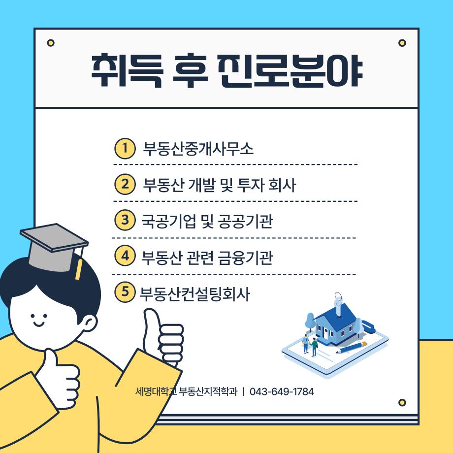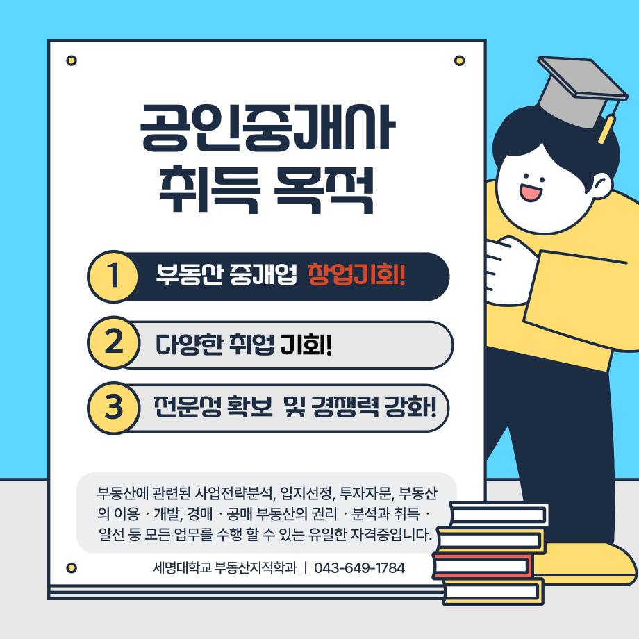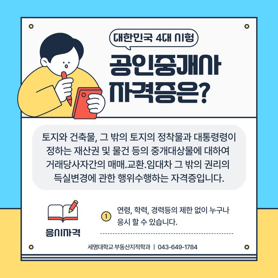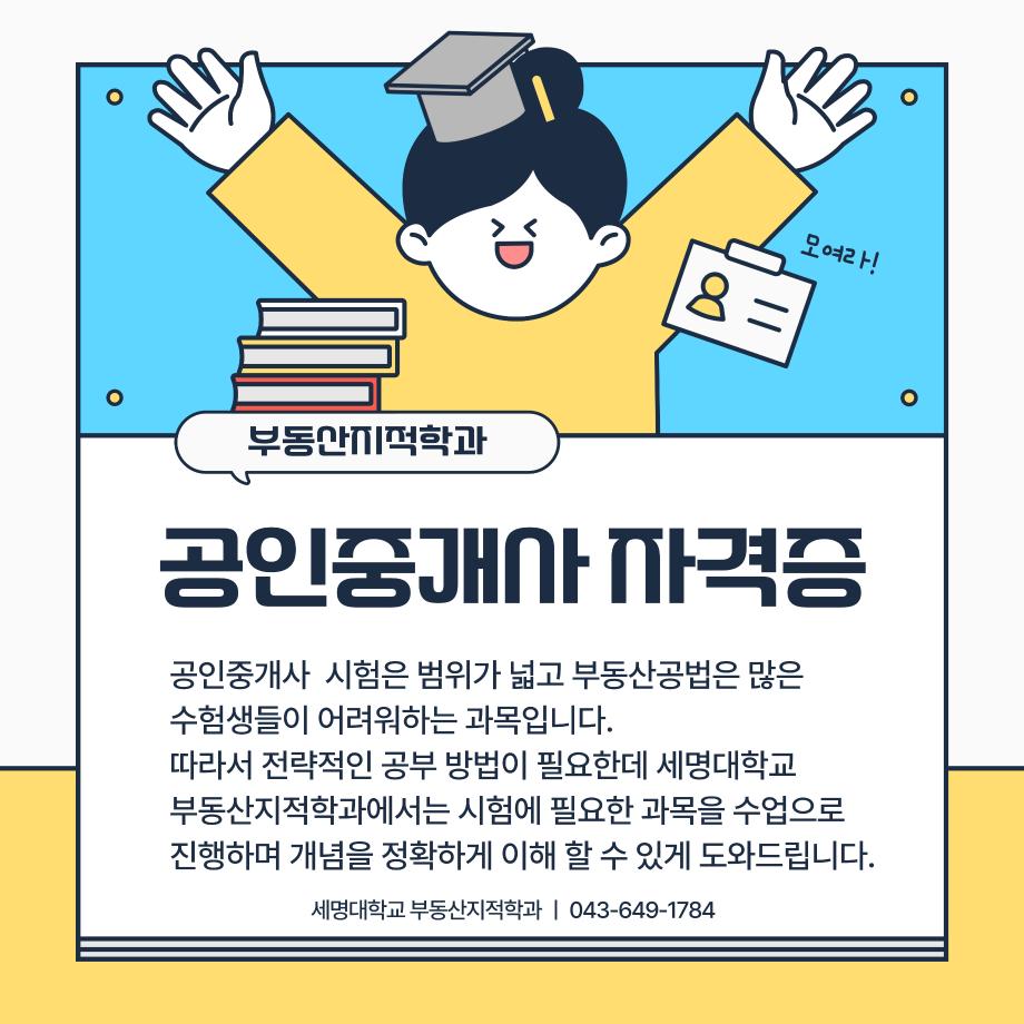 본문 시작 홈으로 학과 소식 학과소개 취업 및 진로 언론 및 보도 학과 소식 대학원 홈페이지가이드 행사사진게시판 행사사진게시판 공지사항 일반자료실 강의자료실 부동산학보 동아리 행사사진게시판 페이스북 트위터 프린트 공인중개사 소개카드 부동산지적학과 2330 2024-11-20 공인중개사 소개 카드입니다. 공인중개사에 관심있는 학생들은 참고하여 주세요. 목록 이전2024학년도 제 35회 부동산지적학과 학술특강 다음 지적기사 소개 카드 담당부서 : 부동산지적학과 담당자 : - 연락처 : 043-649-1784 최종수정일 : 2024-10-26 만족도조사 만족도 조사 이 페이지에서 제공하는 정보에 대하여 만족하시나요? 매우만족 만족 보통 불만족 매우불만족