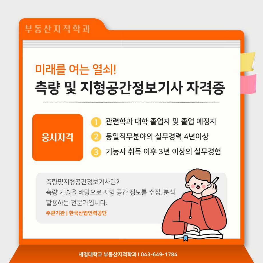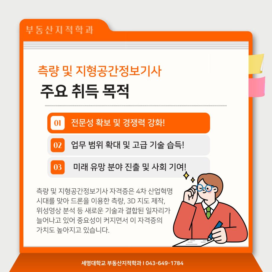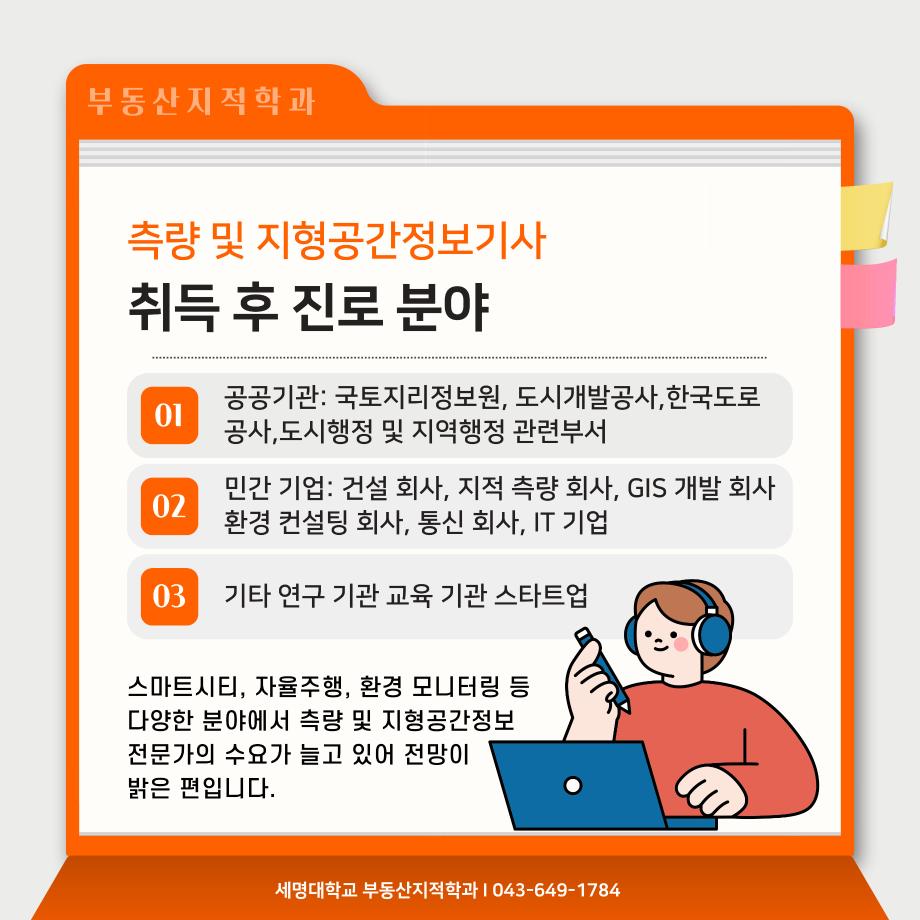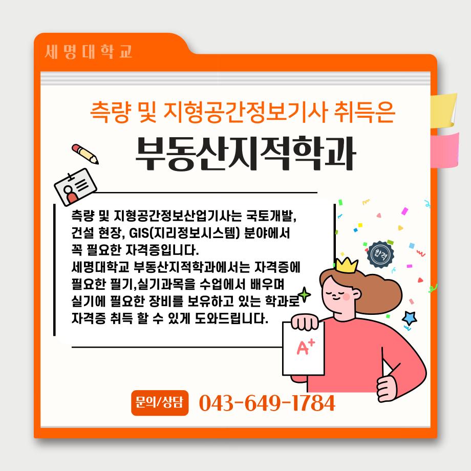 본문 시작 홈으로 학과 소식 학과소개 취업 및 진로 언론 및 보도 학과 소식 대학원 홈페이지가이드 행사사진게시판 행사사진게시판 공지사항 일반자료실 강의자료실 부동산학보 동아리 행사사진게시판 페이스북 트위터 프린트 측량 및 지형공간정보기사 소개카트 부동산지적학과 2487 2024-12-09 측량 및 지형공간정보기사 소개입니다. 측량 및 지형공간정보기사에 관심있는 학생들은 참고하여 주세요. 목록 이전자산관리사 소개 카드입니다. 다음 (주)올포랜드와 1억5천 상당 소프트웨어 현물기부 협약체결 담당부서 : 부동산지적학과 담당자 : - 연락처 : 043-649-1784 최종수정일 : 2024-10-26 만족도조사 만족도 조사 이 페이지에서 제공하는 정보에 대하여 만족하시나요? 매우만족 만족 보통 불만족 매우불만족
