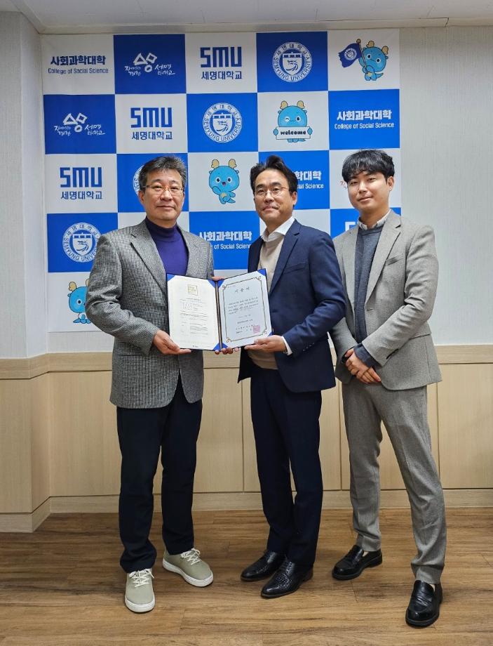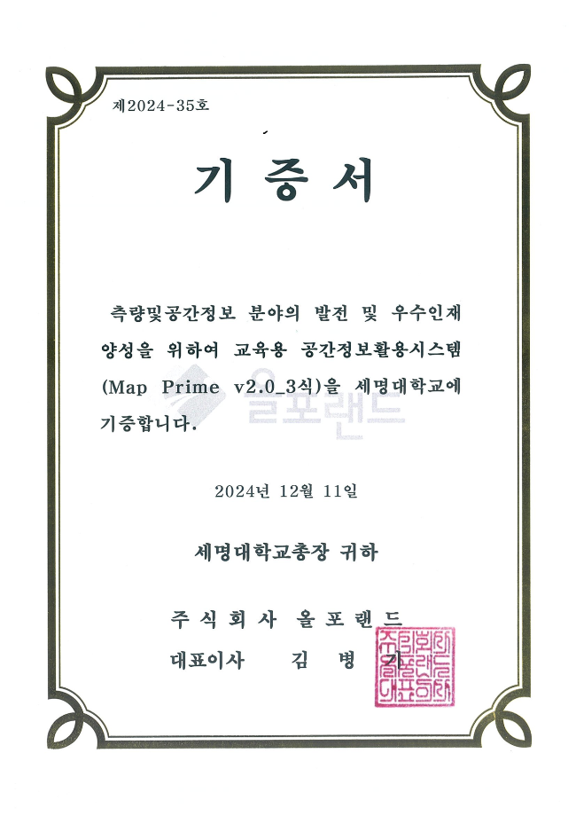 세명대학교(총장 권동현) 부동산지적학과는 2024년 12월 11일 수요일 오전 11시30분 사회과학대학 학장실에서 ㈜올포랜드(대표이사 김병기)와 약 1억5천만원 상당의 ‘MapPrime v2.0’ GIS 프로그램 3종에 대한 현물기부 기증을 채결했다.