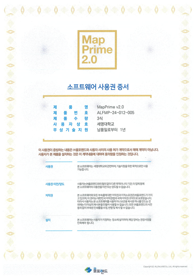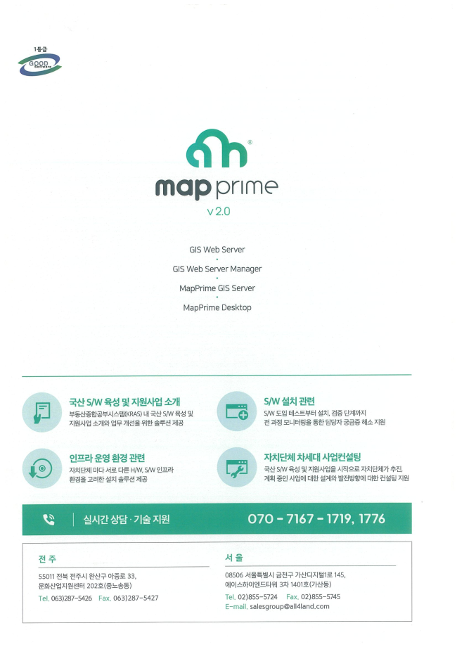 해당 소프트웨어 ‘MapPrime v2.0’은 OGC국제표준 지리공간정보 편집 및 시각화 서비스 가능한 제품으로 GIS WEB Service 구축 및 C/S기반 공간정보 관리 시스템에 적용하여 사용한다.