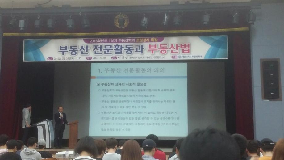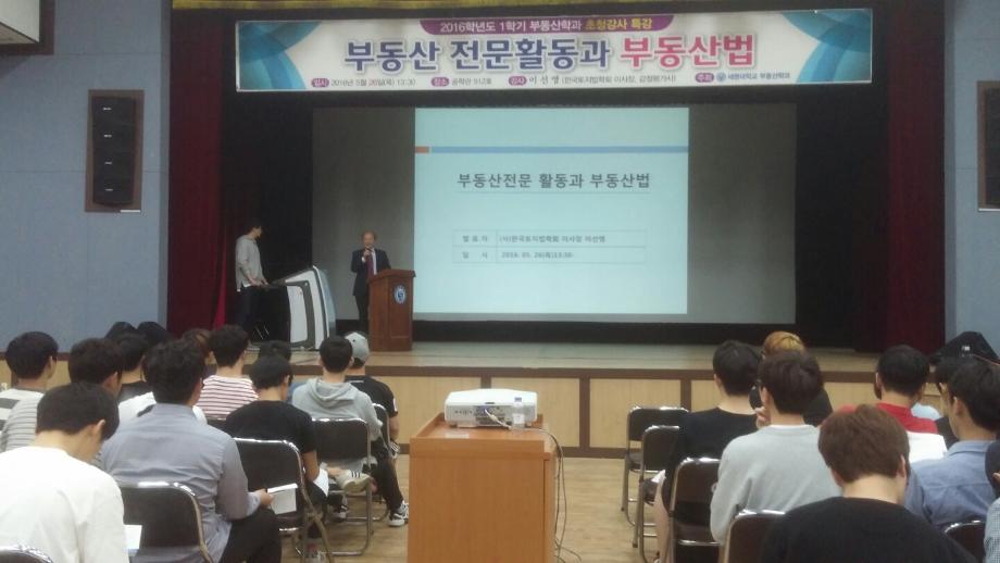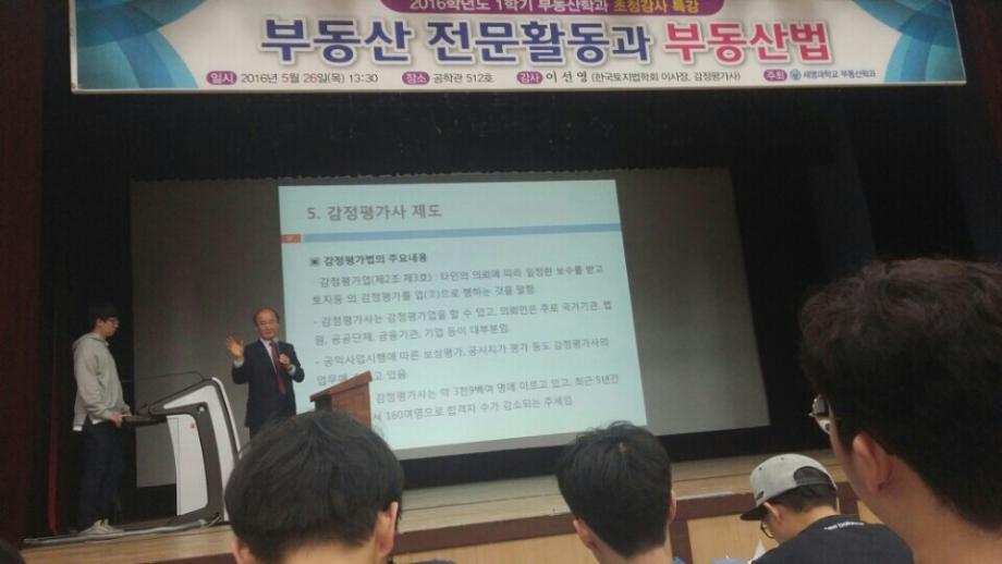 본문 시작 홈으로 학과 소식 학과소개 취업 및 진로 언론 및 보도 학과 소식 대학원 홈페이지가이드 행사사진게시판 행사사진게시판 공지사항 일반자료실 강의자료실 부동산학보 동아리 행사사진게시판 페이스북 트위터 프린트 2016년 1학기부동산학과 초청강사 특강 전체관리자 9546 2016-06-03 2016년 1학기부동산학과 초청강사 특강 <부동산 전문활동과 부동산법> 일시 : 2016. 05. 26 목 장소 : 공학관 512호 한국토지 법학회 이사장 이선영님께서 부동산 전문활동과 부동산법에 대한 강의를 해주셨다 과거와 현재에 대한 부동산 지식과 달라진 점에 대하여 설명해해 주셨다. 목록 이전2016 졸업생 취업특강 이전2016년도 한국지역개발학회 춘계종합학술대회 참가 담당부서 : 부동산지적학과 담당자 : - 연락처 : 043-649-1784 최종수정일 : 2024-10-26 만족도조사 만족도 조사 이 페이지에서 제공하는 정보에 대하여 만족하시나요? 매우만족 만족 보통 불만족 매우불만족