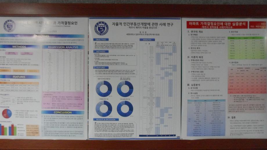 세명대학교 부동산학과(학과장 권기욱)는 10월 30일(수) 오후 3시부터 공학관 123호에서 제6회 부동산 학술논문발표 및 토론대회를 실시하였다. 이번 학술제에서는 부동산학과 3학년 및 4학년을 중심으로 선정된 총 29편의 학술논문에 대한 논문발표 및 토론이 있었으며, 이를 토대로 종합토론과 시상식이 이루어졌다. 이번 학술제에서는 “천안시 아파트시장의 특성과 가격결정요인”이란 주제로 논문을 발표한 한광호 학생(3학년)이 대상을 “역세권 개발사업의 방향” - 이종문(4), “아파트가격결정요인에 대한 실증분석”-김진선(4), “서울시 오피스 빌딩 관리비 결정요인 분석”-김지현(4), “자율적 민간부동산 개발에 관한 사례연구”-정지운(4) 학생이 최우수상을 수상하고, 우수상 7명에 대한 시상이 이루어졌다. 학술제를 통하여 부동산학과 학생들의 뜨거운 토론 및 질의 문답이 이루어졌으며 이를 통해 어떤 학술토론보다 성숙한 학술제가 되었고, 부동산학에 대한 관심증진 및 재학생들의 학습능력을 고취시키는 좋은 계기가 되었다.