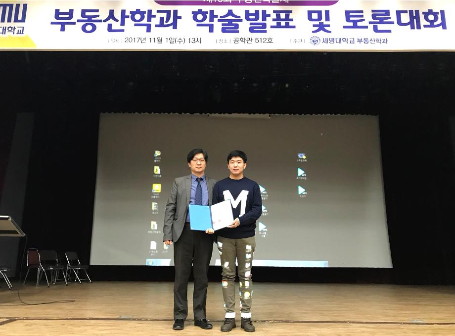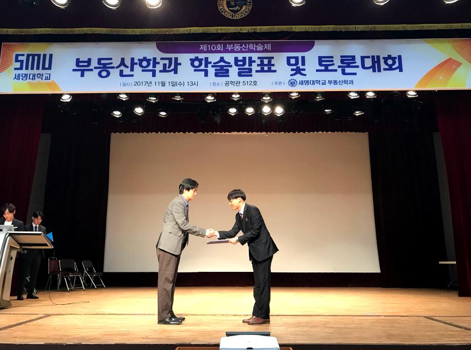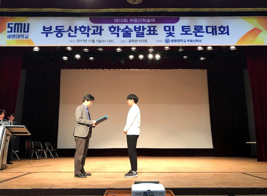 부동산학과 재학생 120여명과 학과 교수님이 참석한 가운데 제10회 부동산 학술논문발표 및 토론대회가 개최되었습니다. 이날 학술논문 발표에서는 '중산층을 위한 주기정책'이란 주제로 논문을 발표한 4학년 배춘섭학생이 대상을 '주택연금 계약해지의 결정요인에 관한 연구'의 2학년 손석찬학생이 최우수상을 '부동산 전자상거래' 4학년 홍창희학생이 우수상을 '제천 의림지의 아름다운 길을걸으며'의 3학년 김홍식학생이 장려상을 수상하였습니다.