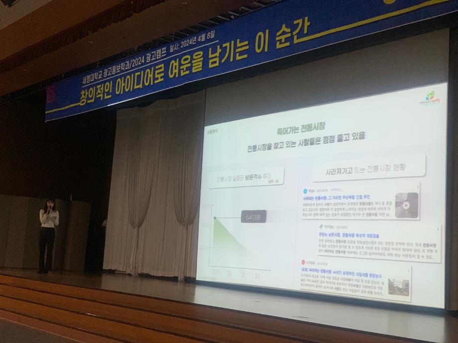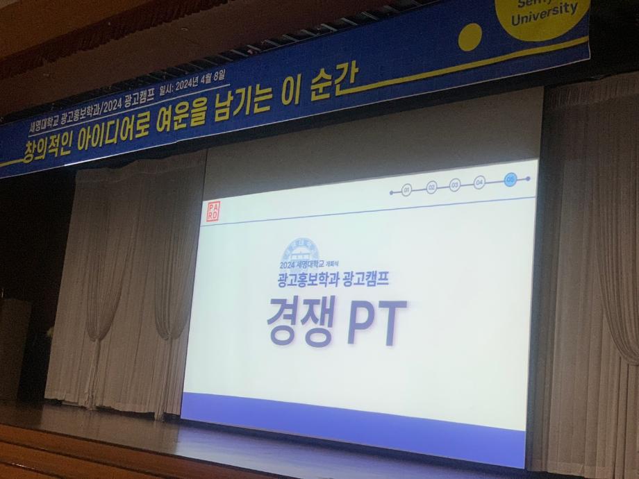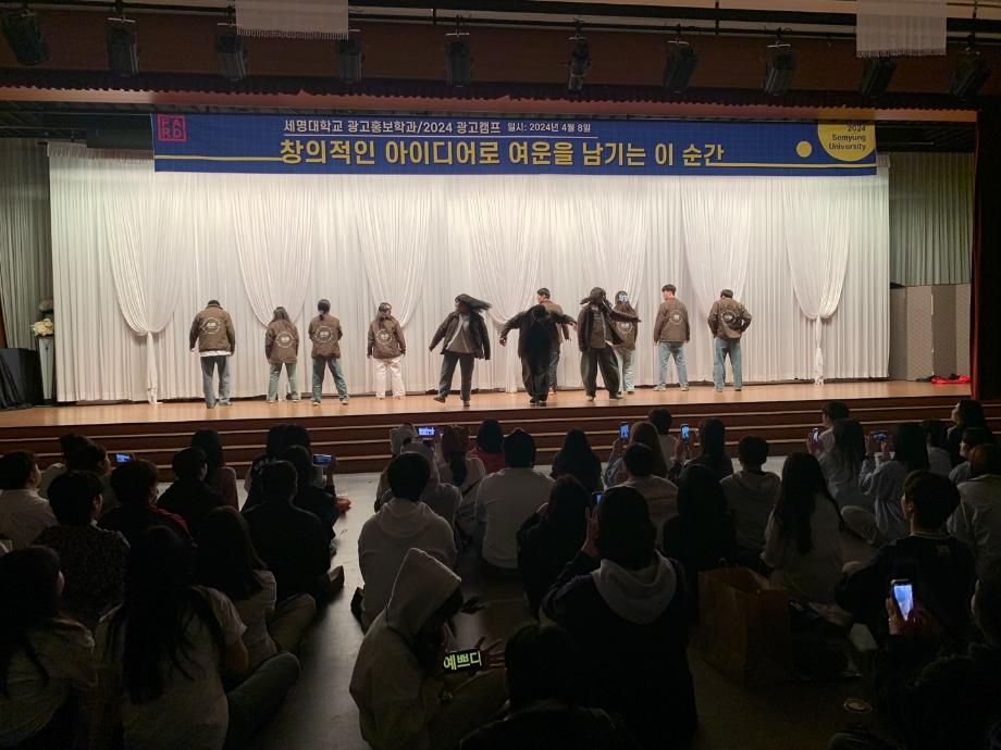 본문 시작 홈으로 특별CC프로그램 매력적인 학과소개 흥미로운 교육과정 특별CC프로그램 We can 취업 따뜻한 커뮤니티 홈페이지가이드 광고캠프 광고캠프 광고영상 제작실습 광고디자인 자격증취득 C&E(도전!경험!) 활동 작품 활동 활동 페이스북 트위터 프린트 2024광고캠프 광고홍보학과 2146 2024-07-17 세명대 광고홍보학과의 시그니처 프로그램 <2024년도 광고캠프> 개최 _일시 : 24년 4월 8~ 9일(1박 2일) _장소 : 영월 동강 시스타 _대상 : 광고홍보학과 1~4학년 _프로그램 : 광고기획서 경쟁 PT, 장기자랑, 요리경연대회, 게임, 힐링시간 등 목록 이전2023년 광고캠프 다음 2025광고캠프