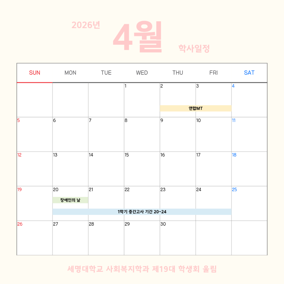 본문 시작 홈으로 커뮤니티 학과소개 교수소개 교육과정 현장실습 및 취업정보 커뮤니티 홈페이지가이드 학사일정 학과공지 학사일정 학생회 동아리 학생 소통 광장 포토갤러리 전공자료실 서식자료실 학사일정 페이스북 트위터 프린트 4월 학사 일정 사회복지학과 4 2026-04-06 4월 학사 일정입니다. 목록 이전3월 학사 일정 담당부서 : 사회복지학과 담당자 : - 연락처 : 043-649-1799 최종수정일 : 2024-10-26 만족도조사 만족도 조사 이 페이지에서 제공하는 정보에 대하여 만족하시나요? 매우만족 만족 보통 불만족 매우불만족