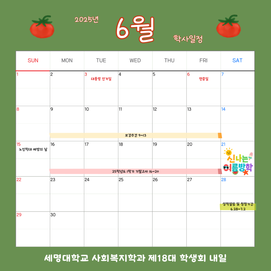 본문 시작 홈으로 커뮤니티 학과소개 교수소개 교육과정 현장실습 및 취업정보 커뮤니티 홈페이지가이드 학사일정 학과공지 학사일정 학생회 동아리 학생 소통 광장 포토갤러리 전공자료실 서식자료실 학사일정 페이스북 트위터 프린트 6월 학사 일정 사회복지학과 805 2025-09-04 2025학년도 6월 학사 일정입니다. 목록 이전5월 학사 일정 다음 8월 학사 일정 담당부서 : 사회복지학과 담당자 : - 연락처 : 043-649-1799 최종수정일 : 2024-10-26 만족도조사 만족도 조사 이 페이지에서 제공하는 정보에 대하여 만족하시나요? 매우만족 만족 보통 불만족 매우불만족