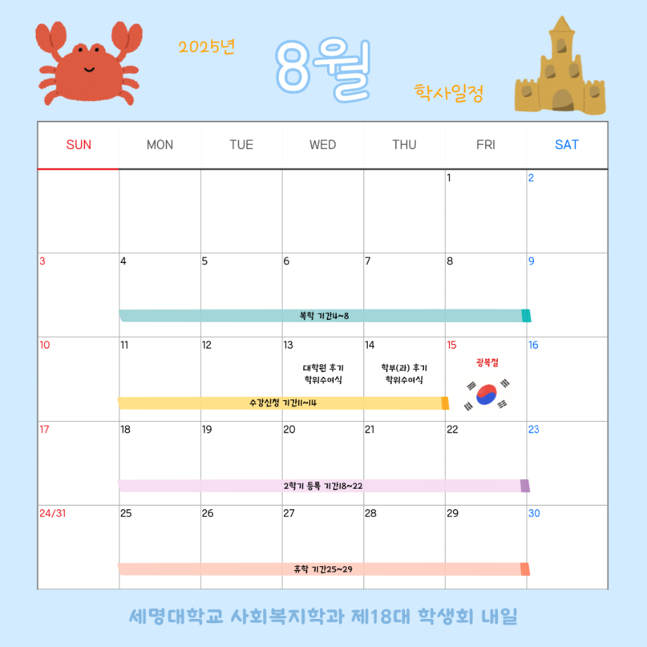 본문 시작 홈으로 커뮤니티 학과소개 교수소개 교육과정 현장실습 및 취업정보 커뮤니티 홈페이지가이드 학사일정 학과공지 학사일정 학생회 동아리 학생 소통 광장 포토갤러리 전공자료실 서식자료실 학사일정 페이스북 트위터 프린트 8월 학사 일정 사회복지학과 903 2025-09-04 2025학년도 8월 학사 일정입니다. 목록 이전6월 학사 일정 다음 9월 학사 일정 담당부서 : 사회복지학과 담당자 : - 연락처 : 043-649-1799 최종수정일 : 2024-10-26 만족도조사 만족도 조사 이 페이지에서 제공하는 정보에 대하여 만족하시나요? 매우만족 만족 보통 불만족 매우불만족