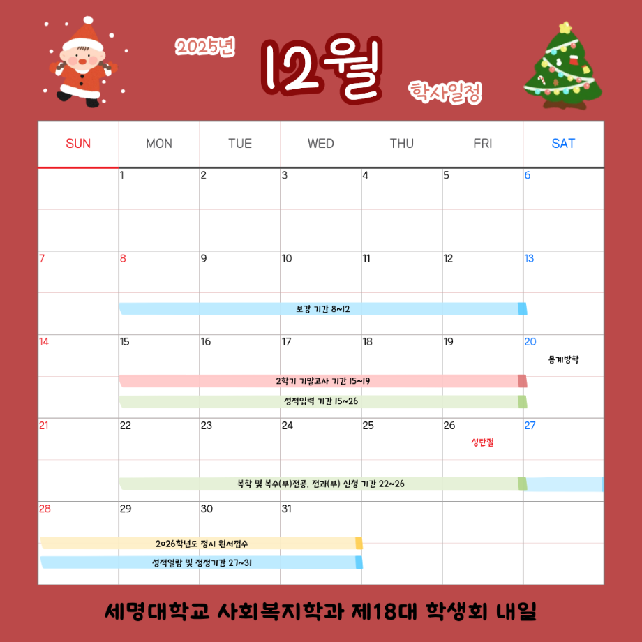 본문 시작 홈으로 커뮤니티 학과소개 교수소개 교육과정 현장실습 및 취업정보 커뮤니티 홈페이지가이드 학사일정 학과공지 학사일정 학생회 동아리 학생 소통 광장 포토갤러리 전공자료실 서식자료실 학사일정 페이스북 트위터 프린트 12월 학사 일정 사회복지학과 668 2025-12-03 12월 학사 일정 입니다. 목록 이전11월 학사 일정 다음 2월 학사 일정 담당부서 : 사회복지학과 담당자 : - 연락처 : 043-649-1799 최종수정일 : 2024-10-26 만족도조사 만족도 조사 이 페이지에서 제공하는 정보에 대하여 만족하시나요? 매우만족 만족 보통 불만족 매우불만족
