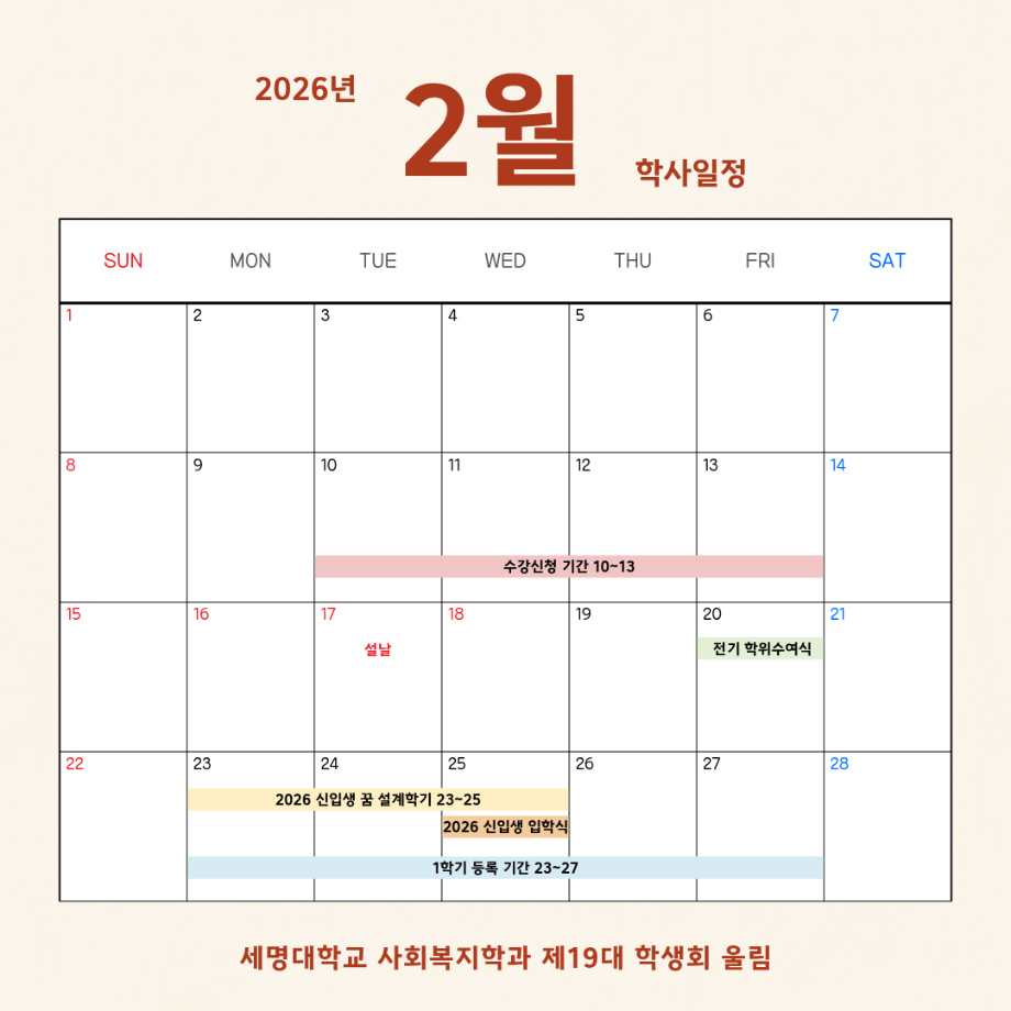 본문 시작 홈으로 커뮤니티 학과소개 교수소개 교육과정 현장실습 및 취업정보 커뮤니티 홈페이지가이드 학사일정 학과공지 학사일정 학생회 동아리 학생 소통 광장 포토갤러리 전공자료실 서식자료실 학사일정 페이스북 트위터 프린트 2월 학사 일정 사회복지학과 385 2026-02-05 2월 학사 일정입니다. 목록 이전12월 학사 일정 다음 3월 학사 일정 담당부서 : 사회복지학과 담당자 : - 연락처 : 043-649-1799 최종수정일 : 2024-10-26 만족도조사 만족도 조사 이 페이지에서 제공하는 정보에 대하여 만족하시나요? 매우만족 만족 보통 불만족 매우불만족