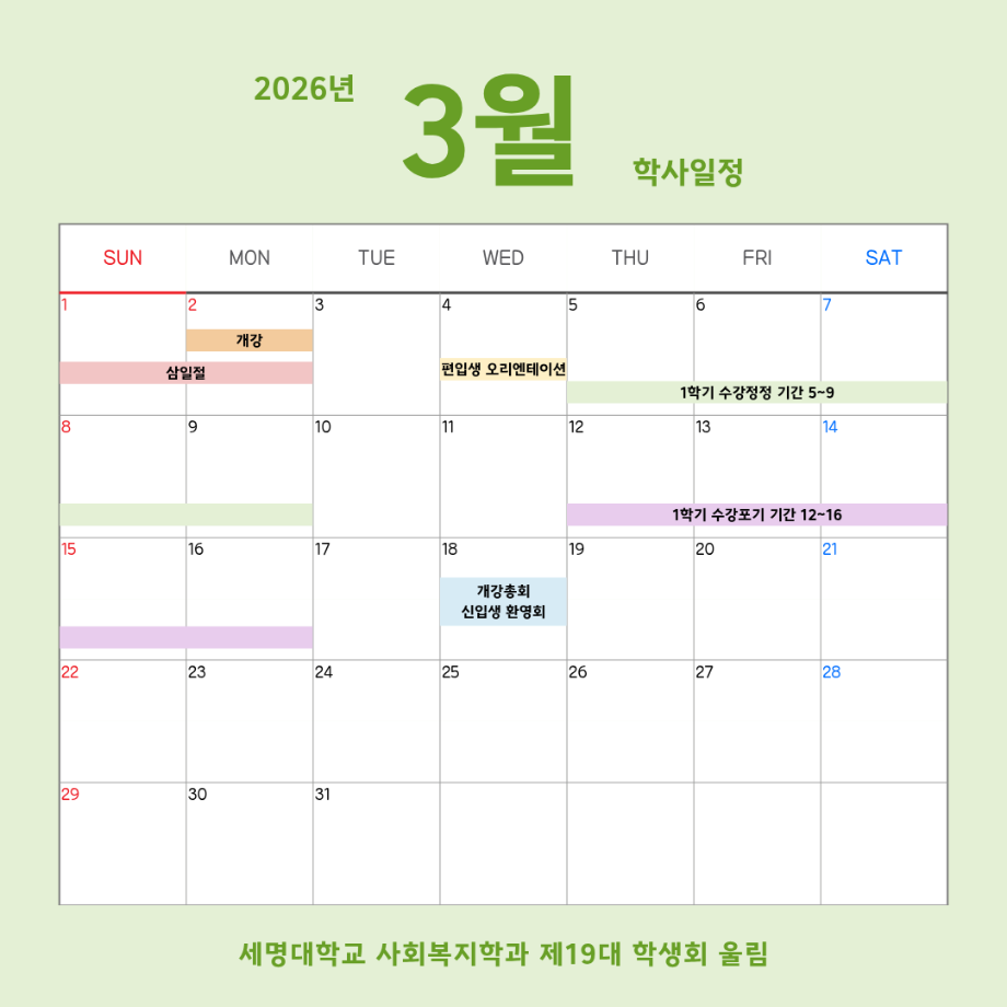 본문 시작 홈으로 커뮤니티 학과소개 교수소개 교육과정 현장실습 및 취업정보 커뮤니티 홈페이지가이드 학사일정 학과공지 학사일정 학생회 동아리 학생 소통 광장 포토갤러리 전공자료실 서식자료실 학사일정 페이스북 트위터 프린트 3월 학사 일정 사회복지학과 209 2026-03-04 3월 학사 일정입니다. 목록 이전2월 학사 일정 담당부서 : 사회복지학과 담당자 : - 연락처 : 043-649-1799 최종수정일 : 2024-10-26 만족도조사 만족도 조사 이 페이지에서 제공하는 정보에 대하여 만족하시나요? 매우만족 만족 보통 불만족 매우불만족