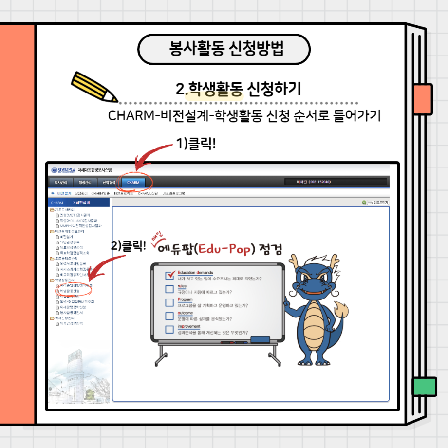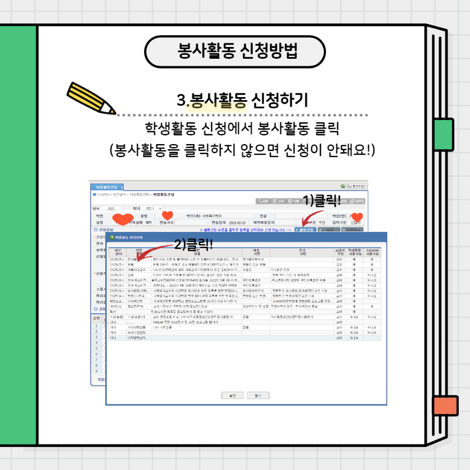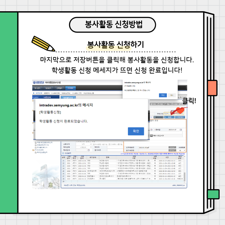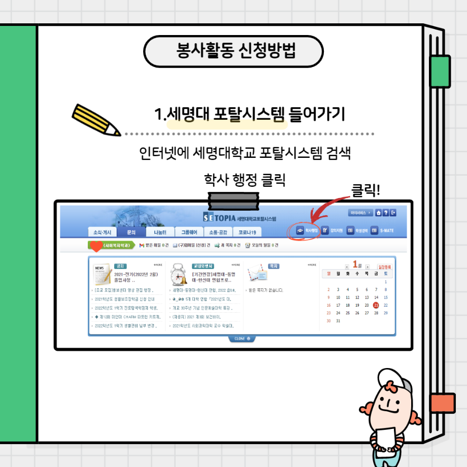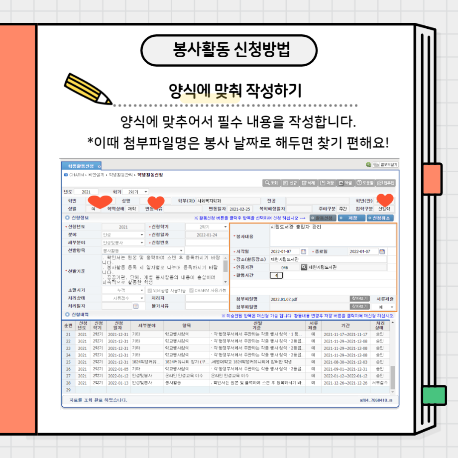 본문 시작 홈으로 커뮤니티 학과소개 교수소개 교육과정 현장실습 및 취업정보 커뮤니티 홈페이지가이드 학생 소통 광장 학과공지 학사일정 학생회 동아리 학생 소통 광장 포토갤러리 전공자료실 서식자료실 학생 소통 광장 페이스북 트위터 프린트 봉사활동 신청방법 사회복지학과 3114 2022-01-28 봉사활동 신청하는 방법입니다!! 봉사활동 많이 하고 미리 신청까지 해두세요~ 목록 이전사복과 선배님께 여쭤봐(4학년) 다음 사복과 선배님께 여쭤봐(2,3학년) 담당부서 : 사회복지학과 담당자 : - 연락처 : 043-649-1799 최종수정일 : 2024-10-26 만족도조사 만족도 조사 이 페이지에서 제공하는 정보에 대하여 만족하시나요? 매우만족 만족 보통 불만족 매우불만족
