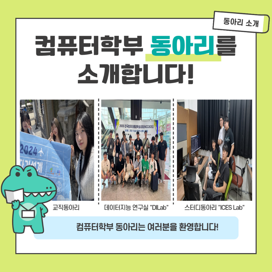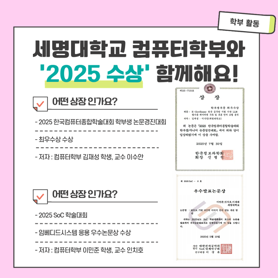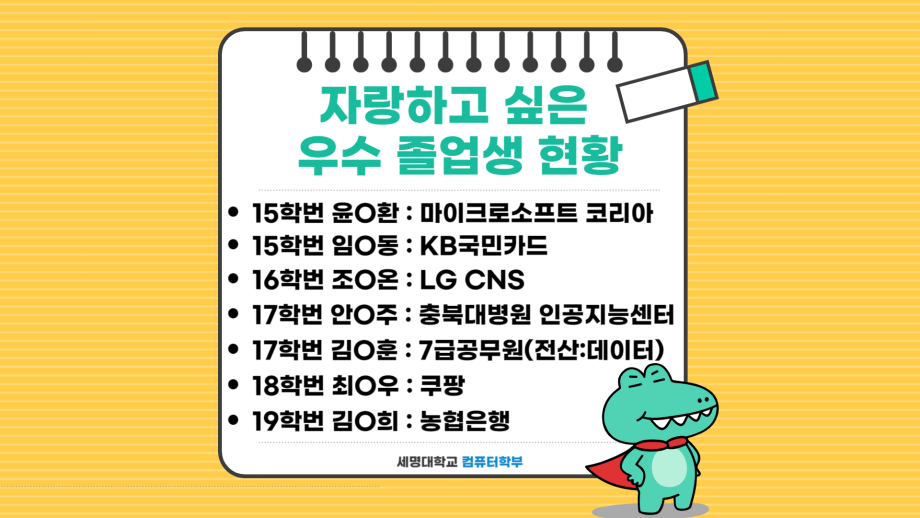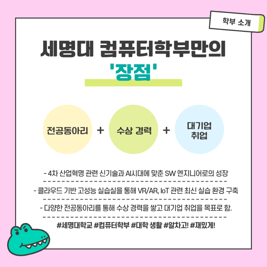 본문 시작 홈으로 학부활동 학부소개 학부활동 교육과정 커뮤니티 학부생활 입학안내 홈페이지가이드 학부갤러리 학부행사 학생회 활동 전공 동아리 학부갤러리 학부갤러리 페이스북 트위터 프린트 컴퓨터학부 소개 전체관리자 1512 2025-09-01 세명대학교 컴퓨터학부 소개 목록 이전세명대 컴퓨터학부 송유정 교수, 제주 유광농장과 함께 제천에 따뜻한 나눔 전하다 다음 2026학년도 수시모집 주요사항 담당부서 : 컴퓨터학부 담당자 : - 연락처 : 043-649-1272 최종수정일 : 2024-10-26 만족도조사 만족도 조사 이 페이지에서 제공하는 정보에 대하여 만족하시나요? 매우만족 만족 보통 불만족 매우불만족