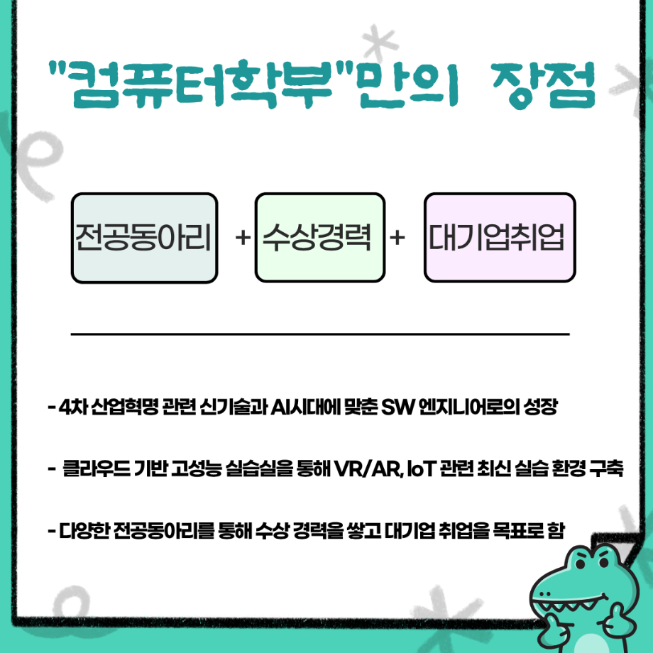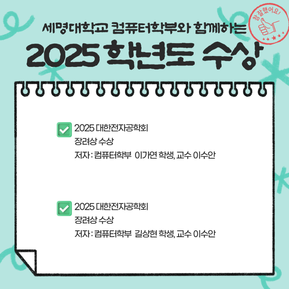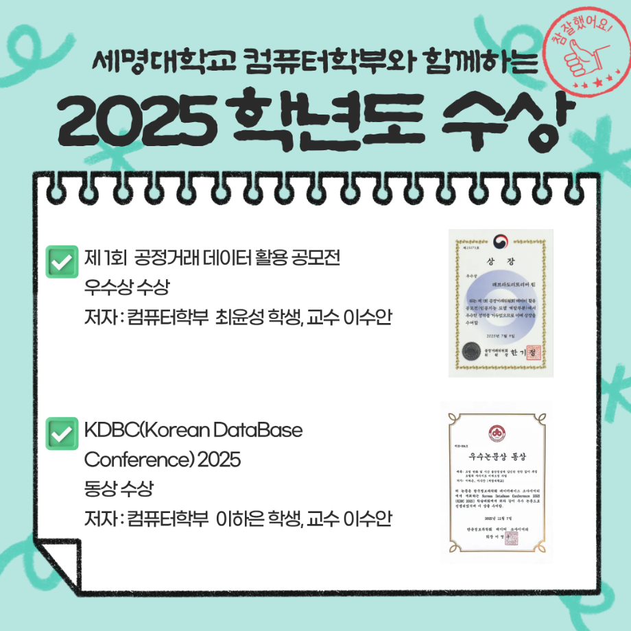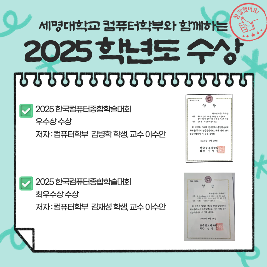 본문 시작 홈으로 학부활동 학부소개 학부활동 교육과정 커뮤니티 학부생활 입학안내 홈페이지가이드 학부갤러리 학부행사 학생회 활동 전공 동아리 학부갤러리 학부갤러리 페이스북 트위터 프린트 컴퓨터학부를 소개합니다 컴퓨터학부 1038 2025-12-30 . 목록 이전한국소프트웨어종합학술대회 (KSC2025) 다음 컴퓨터학부 이수안 교수 세계적 AI 학회 AAAI 2026 논문 채택 담당부서 : 컴퓨터학부 담당자 : - 연락처 : 043-649-1272 최종수정일 : 2024-10-26 만족도조사 만족도 조사 이 페이지에서 제공하는 정보에 대하여 만족하시나요? 매우만족 만족 보통 불만족 매우불만족