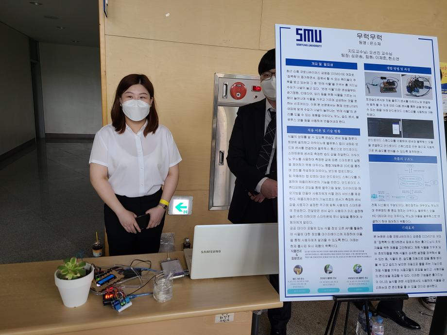본문 시작 홈으로 SMIT 소식 SMIT 소개 SMIT 교육 SMIT 취업 SMIT 소식 SMIT 입학 홈페이지가이드 경진대회 공지사항 갤러리 경진대회 동아리 경진대회 페이스북 트위터 프린트 2021 캡스톤디자인 장려상 아두이노 습도센서를이용한식물케어 스마트IT학부 4428 2021-09-01 장려상 - 작품명 : 아두이노 습도센서를이용한식물케어 - 지도교수 : 오선진 - 팀원 : 심은송, 이재준, 한소연 코로나19 여파로 ‘집콕족'이 증가하면서 집에서 하는 홈가드닝의 초보자들을 위한 제품을 고안해냈다. 처음 식물을 키우게 되는 초보자들을 위해 센서를 이용하여 앱으로 받아보며 쉬운 식물관리를 도와줄 수 있는 제품을 개발하였다. 목록 이전2020-06-17 온라인 캡스톤디자인 경진대회 다음 2021 캡스톤디자인 장려상 LoRa를 이용한 킥보드 공유서비스 담당부서 : 스마트IT학부 담당자 : - 연락처 : 043-649-1275 최종수정일 : 2024-10-26 만족도조사 만족도 조사 이 페이지에서 제공하는 정보에 대하여 만족하시나요? 매우만족 만족 보통 불만족 매우불만족