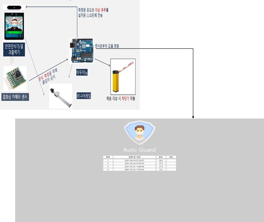 본문 시작 홈으로 SMIT 소식 SMIT 소개 SMIT 교육 SMIT 취업 SMIT 소식 SMIT 입학 홈페이지가이드 경진대회 공지사항 갤러리 경진대회 동아리 경진대회 페이스북 트위터 프린트 2021 캡스톤디자인 우수상 Arduino 기반 자동 높이 조절기능의 안면 체온 측정 장치 스마트IT학부 4639 2021-09-01 우수상 - 작품명 : Arduino 기반 자동 높이 조절기능의 안면 체온 측정 장치 - 지도교수 : 조면균 - 팀원 : 강진우, 정재범, 황원준, 이정환, 박세혁 코로나가 발병한 이후 실내에 출입할 때 체온 체크가 필수가 되었는데 고령자의 경우 거동이 불편하다 보니 얼굴을 체온계 높이에 맞추는 게 힘들다. 이에 Arduino 기반으로 높이를 자동으로 조정하고, 이상 체온의 경우 관리자에게 긴급하게 알린다. 목록 이전2021 캡스톤디자인 우수상 책 읽어드립니다 다음 2021 캡스톤디자인 우수상 Smart On Collar (S.O.C) 담당부서 : 스마트IT학부 담당자 : - 연락처 : 043-649-1275 최종수정일 : 2024-10-26 만족도조사 만족도 조사 이 페이지에서 제공하는 정보에 대하여 만족하시나요? 매우만족 만족 보통 불만족 매우불만족