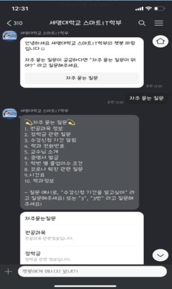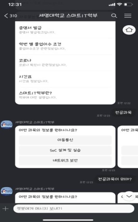 본문 시작 홈으로 SMIT 소식 SMIT 소개 SMIT 교육 SMIT 취업 SMIT 소식 SMIT 입학 홈페이지가이드 경진대회 공지사항 갤러리 경진대회 동아리 경진대회 페이스북 트위터 프린트 2022 캡스톤디자인 최우수상 스마트챗봇 스마트IT학부 8246 2022-06-02 최우수상 - 작품명 : 스마트챗봇 - 지도교수 : 송미화 - 팀원 : 김도연, 서황희, 황태현, 이영건 다수의 사용자들을 동시에 응대하는 다중처리성과 즉각 반응하는 실시간성 등 여러 장점을 갖춘 챗봇을 대다수의 학부생들이 이용하고 있고, 간단하게 접근 가능한 카카오톡에 연동시켜 개발하였다. 목록 이전2022 캡스톤디자인 우수상 Drone GCS Software 다음 멀티모달 기반 인공감성지능 모델 개발 담당부서 : 스마트IT학부 담당자 : - 연락처 : 043-649-1275 최종수정일 : 2024-10-26 만족도조사 만족도 조사 이 페이지에서 제공하는 정보에 대하여 만족하시나요? 매우만족 만족 보통 불만족 매우불만족