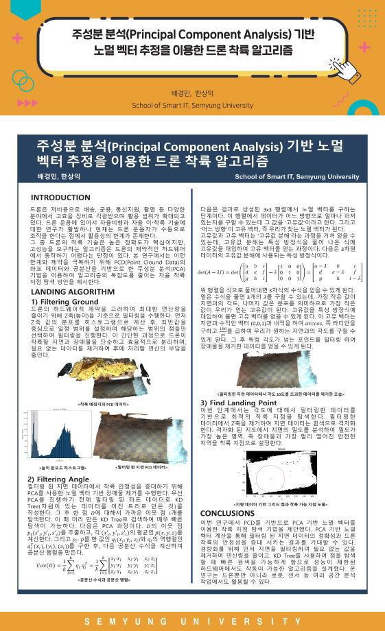 연구를 통하여 사전 정보가 없는 환경에서의 안전하고 성공적인 착륙을 위해 주성분 분석 기반 노멀 벡터 추정 기법을 활용하여 드론 착륙 예정지의 기울기를 계산하고 안전한 드론 착륙지를 도출하였습니다. 본 연구 결과는 드론의 자율 착륙 뿐만 아니라 UAM 등 다양한 비행체의 비상 착륙 환경에서 활용될 수 있을 것으로 기대됩니다.